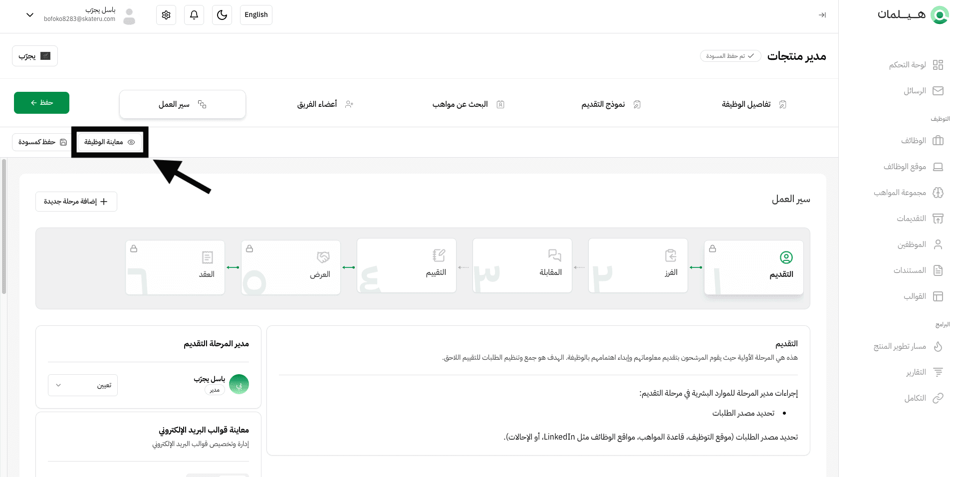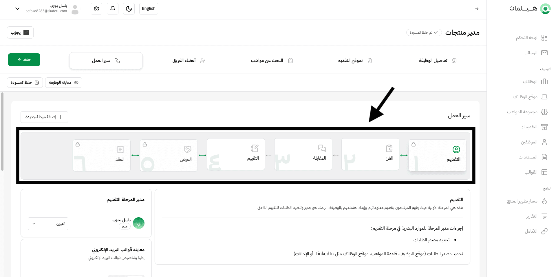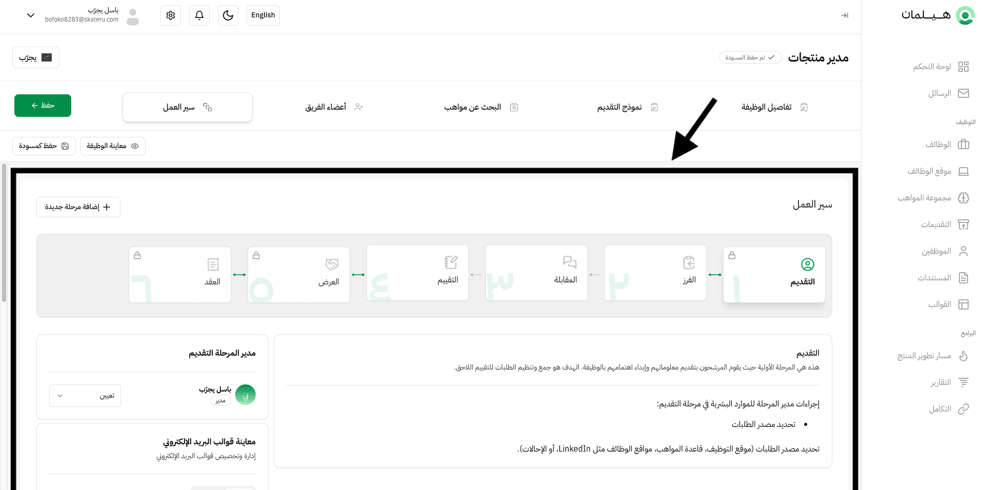 في قسم سير العمل يمكنك رؤية سير عمل كل مرحلة من مراحل التقديم على الوظيفة وتعيينها بالشكل الذي يناسبك