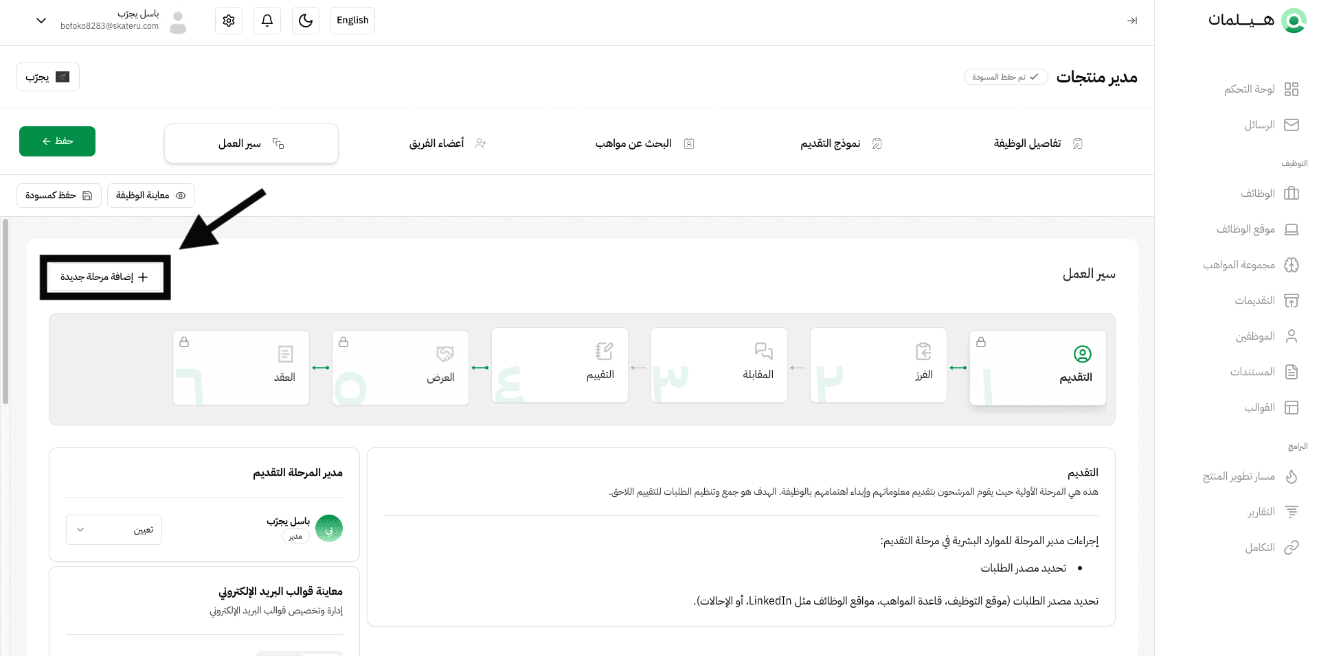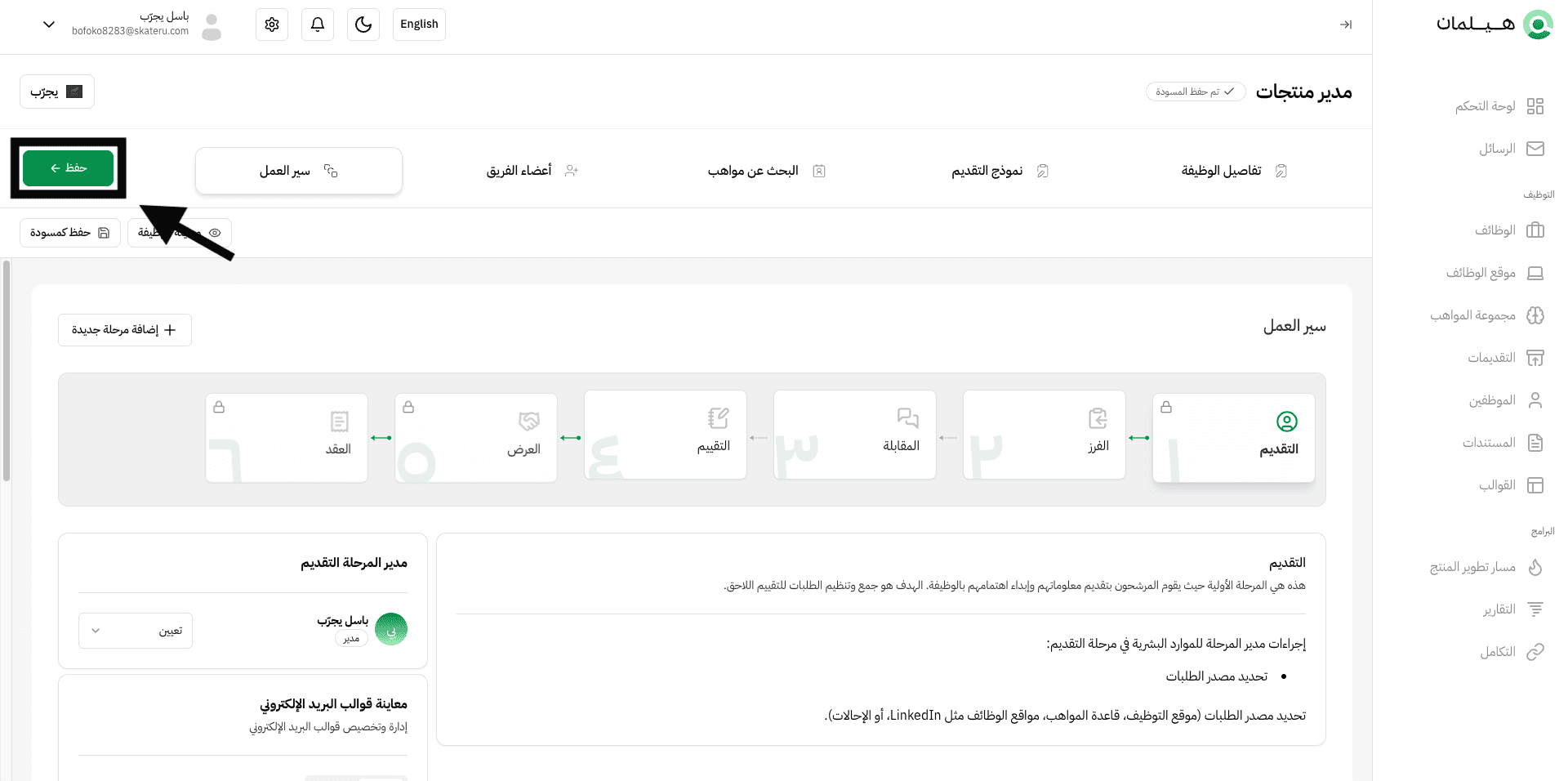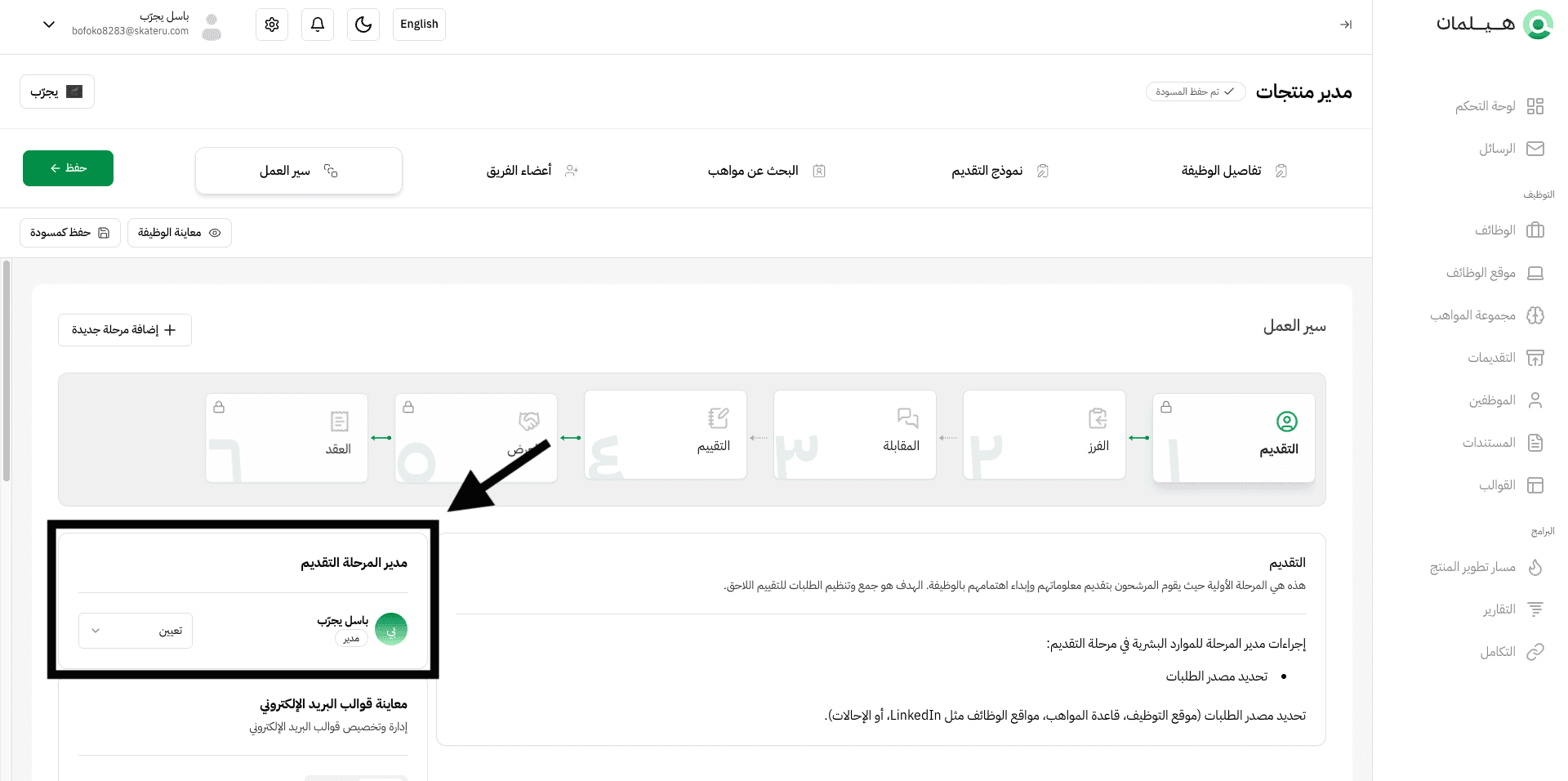 في قسم سير العمل يمكنك رؤية سير عمل كل مرحلة من مراحل التقديم على الوظيفة وتعيينها بالشكل الذي يناسبك