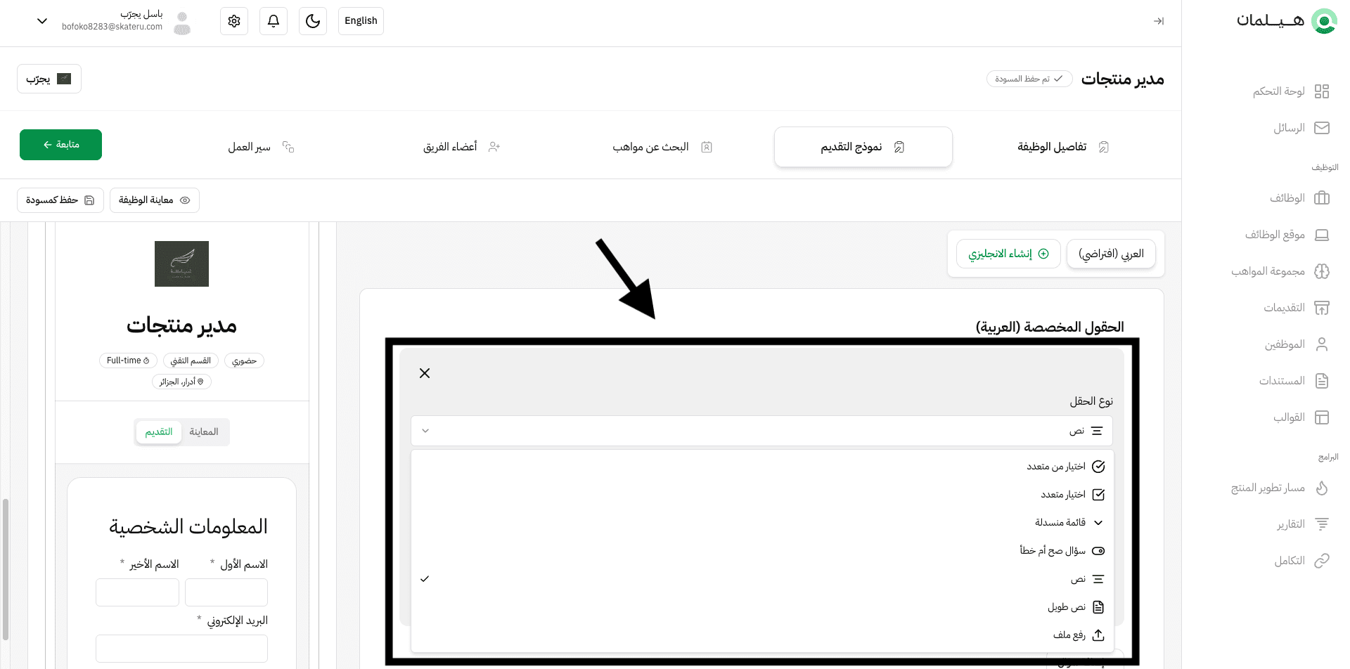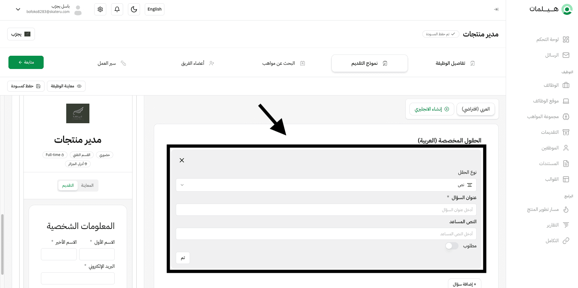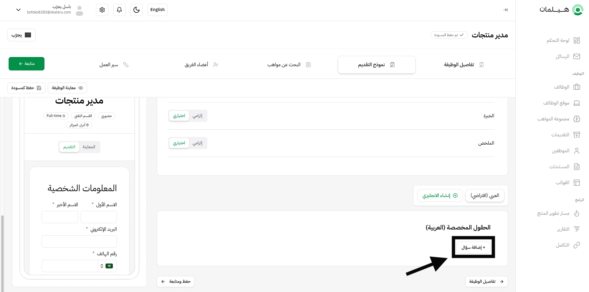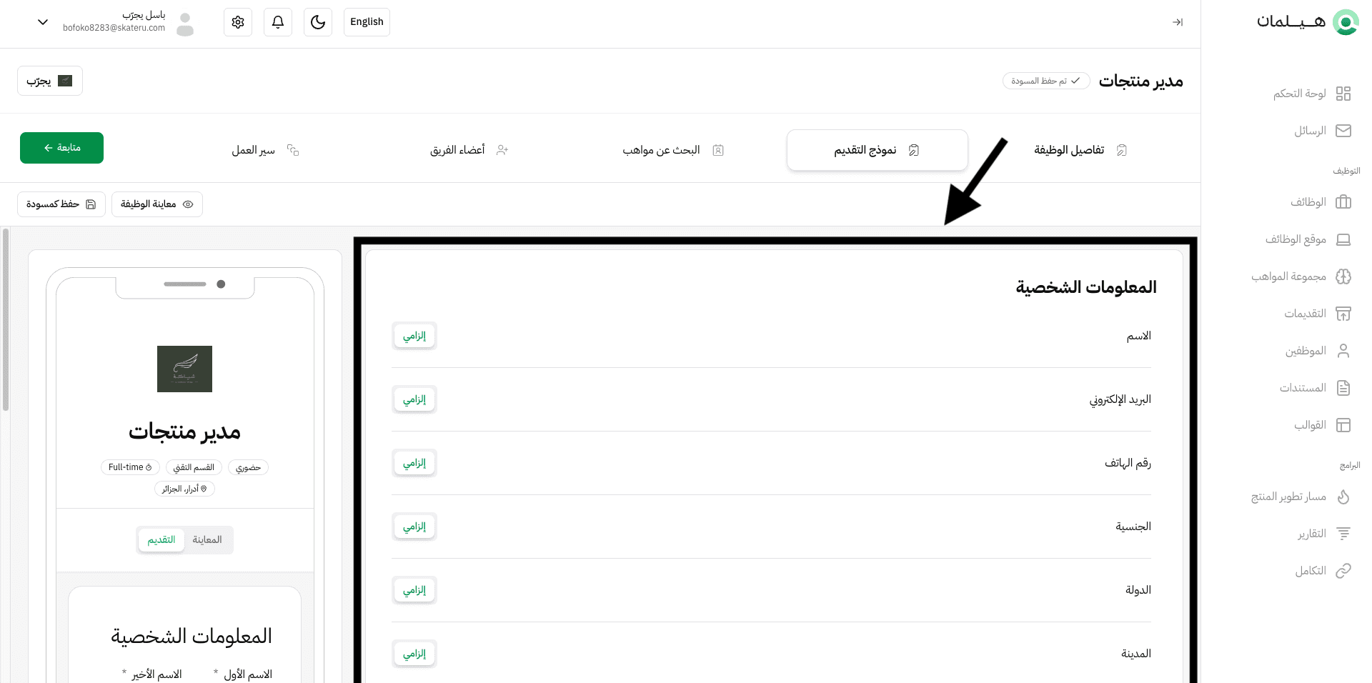 من هنا تبدأ عملية جمع البيانات التي تتم تعبئتها من قِبل المتقدم للوظيفة، حيث يمكنك تعيين الأسئلة المطلوبة وغيرها