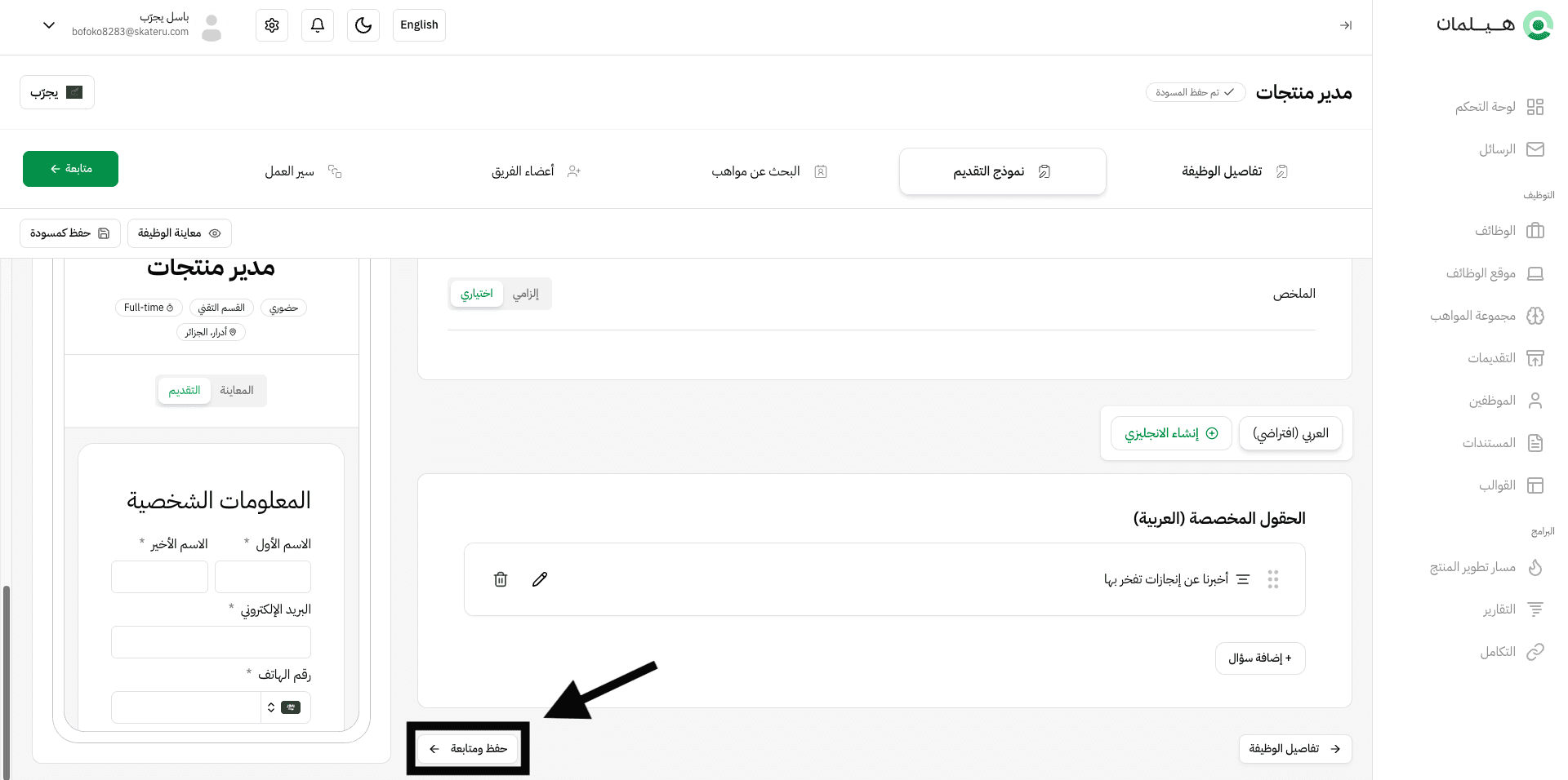 ثم قم بالنقر على “حفظ ومتابعة” من الأسفل أو من على “حفظ ومتابعة” بالأعلى للذهاب للقسم التالي
