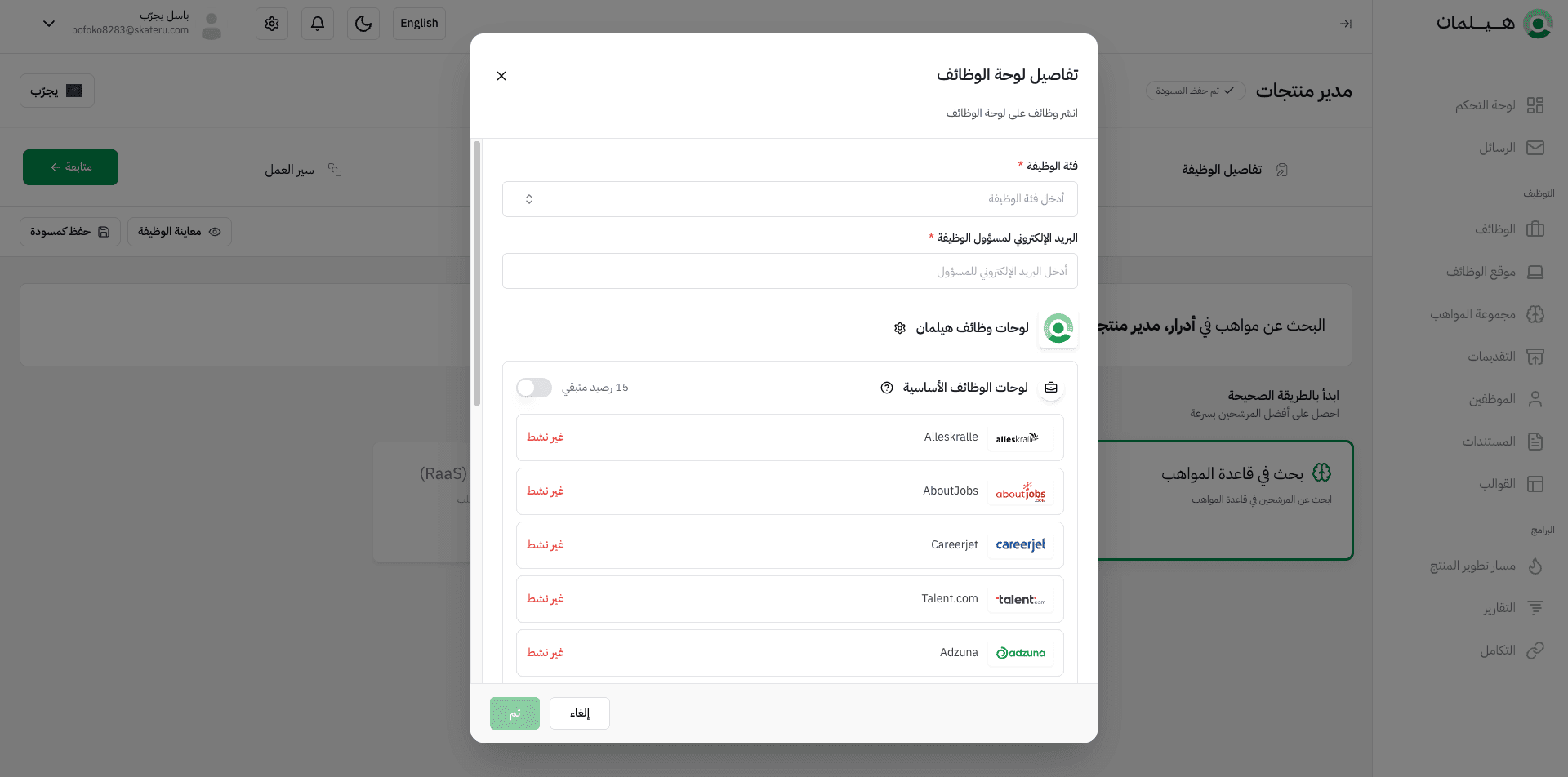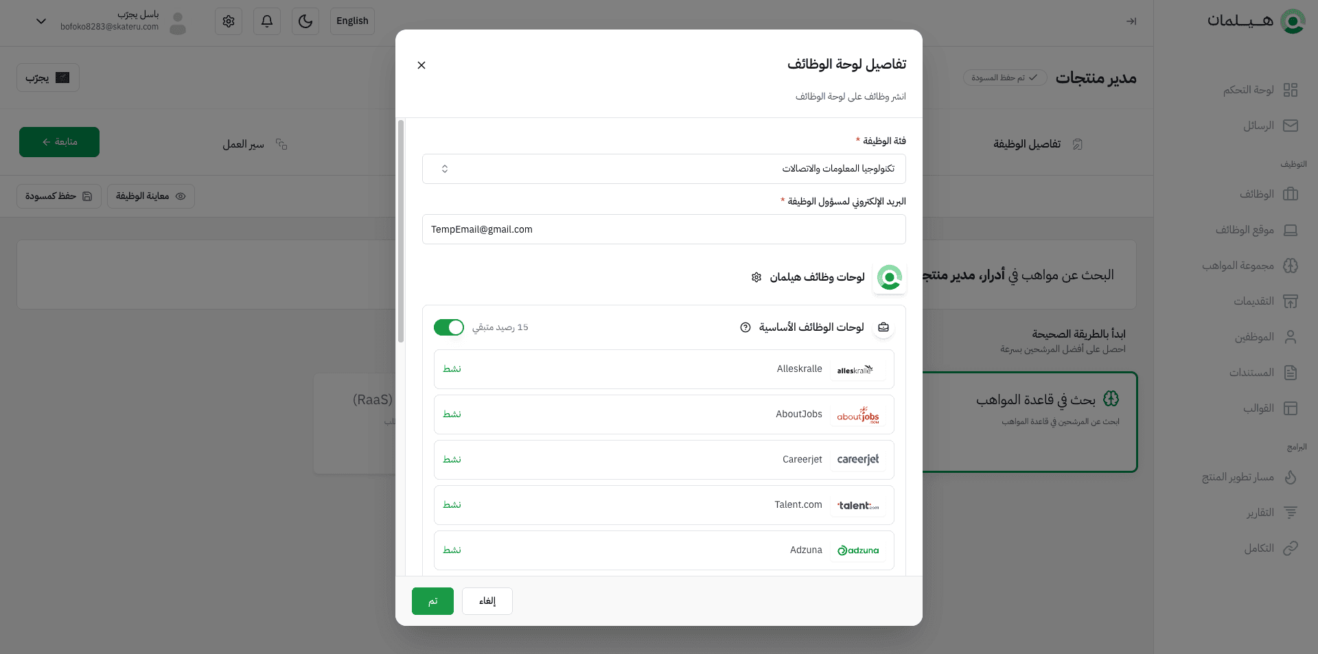 ويمكنك ايضًا نشرها في لوحة الوظائف من خلال النقر على “نشر الوظائف على لوحة الوظائف” حيث تتيح لك هذه الميزة نشر الوظيفة مجموعة من منصات التوظيف (مثال: لينكدان، تالنت.كوم، وغيرها الكثير)