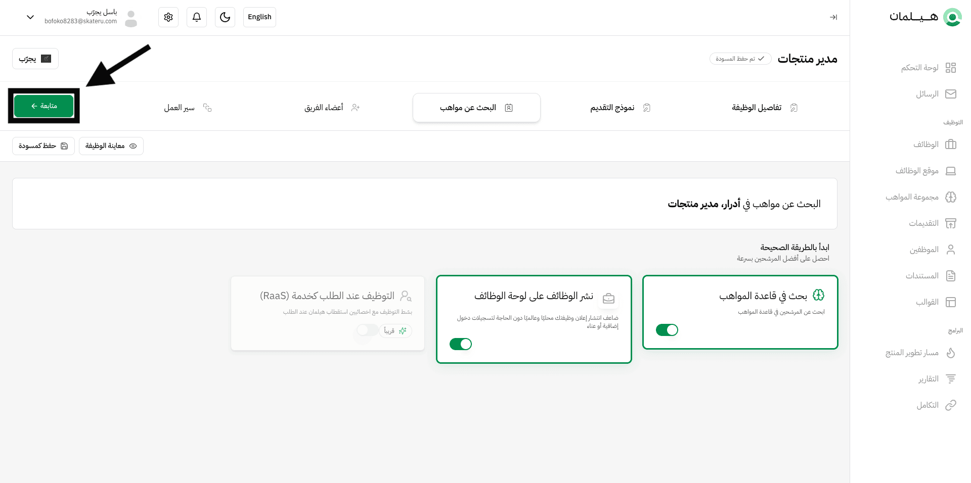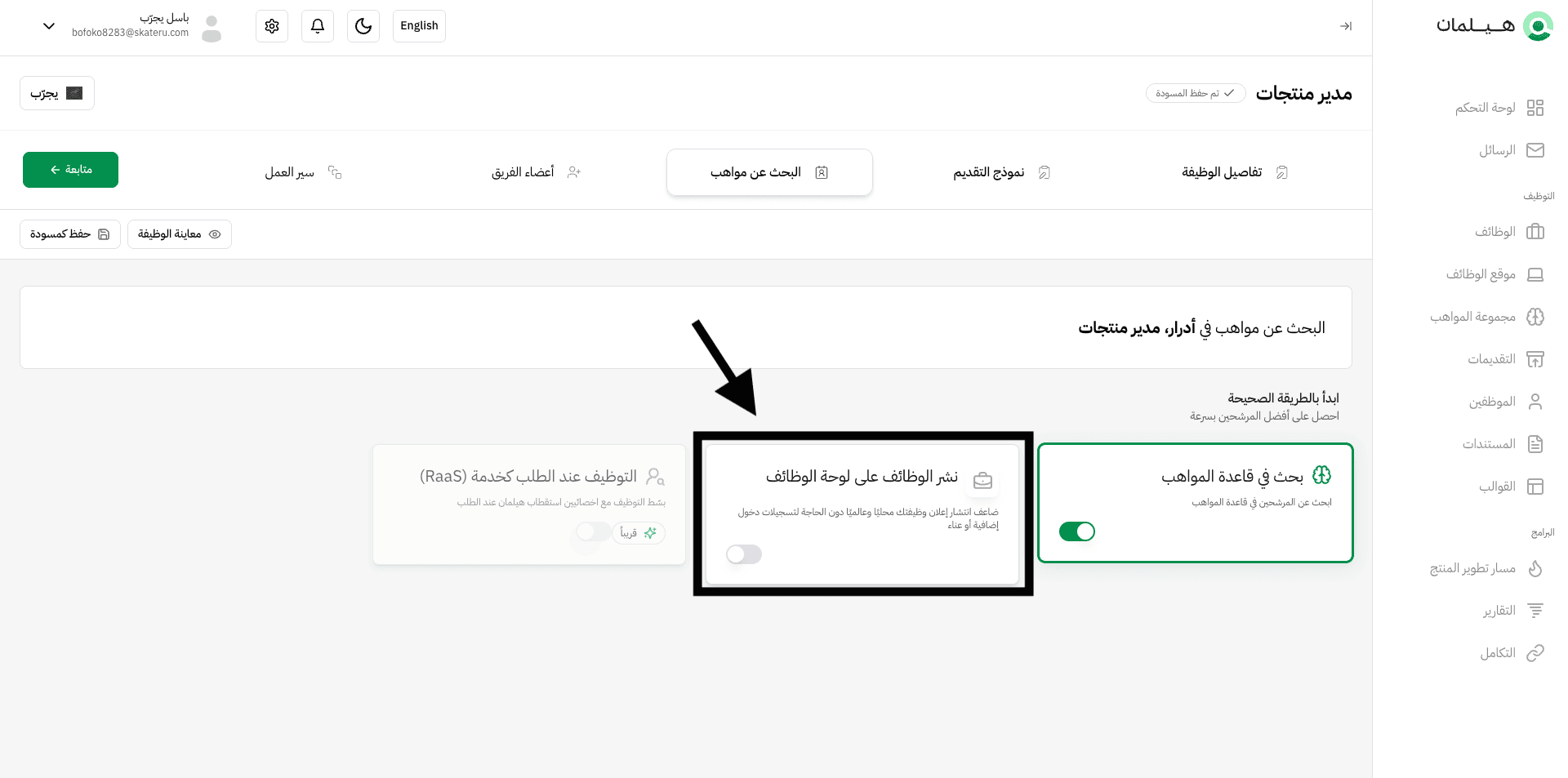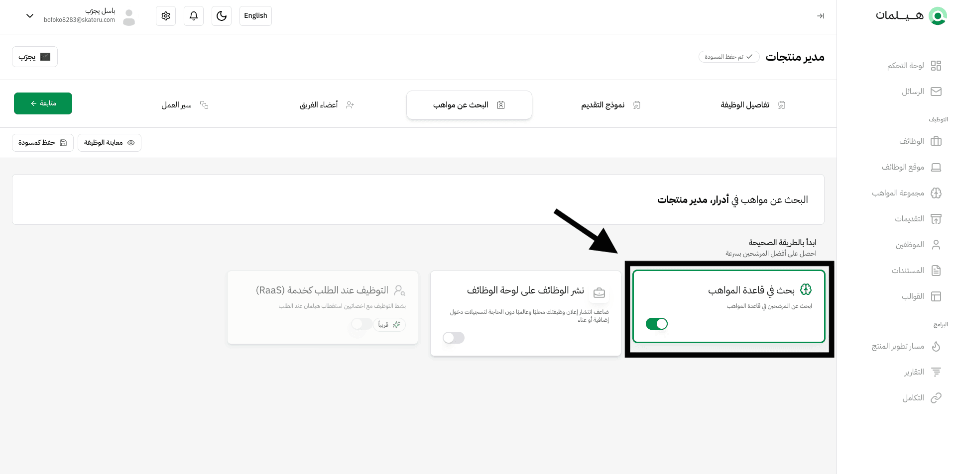 في صفحة “البحث عن مواهب” يمكنك نشر وظيفتك على صفحة المواهب في هيلمان من خلال النقر على “بحث في قاعدة المواهب”