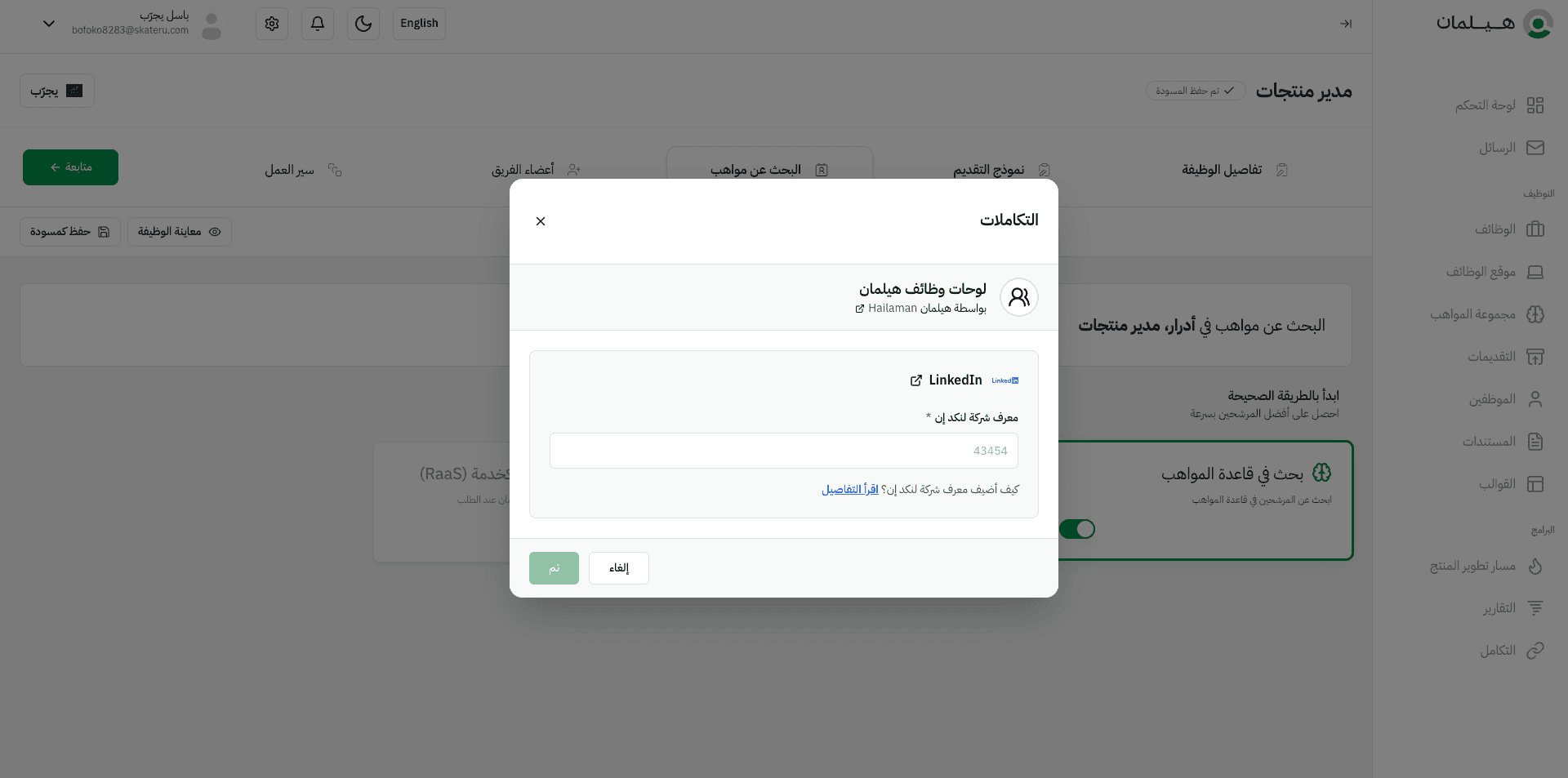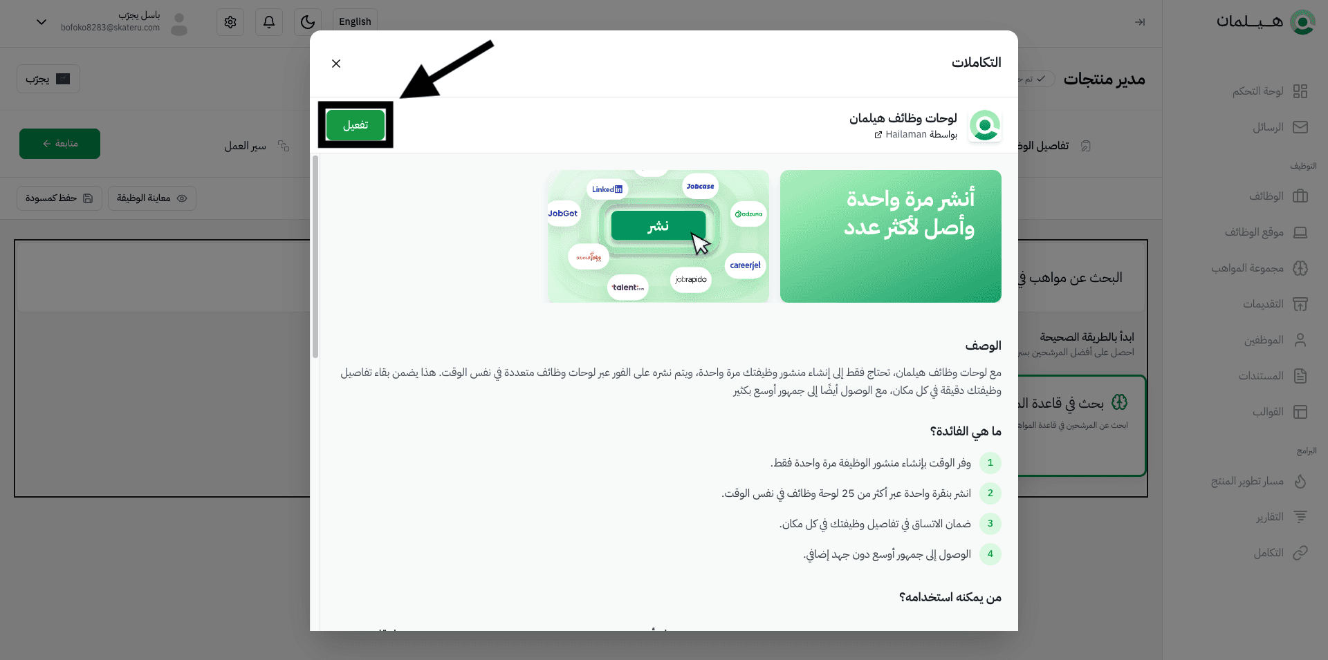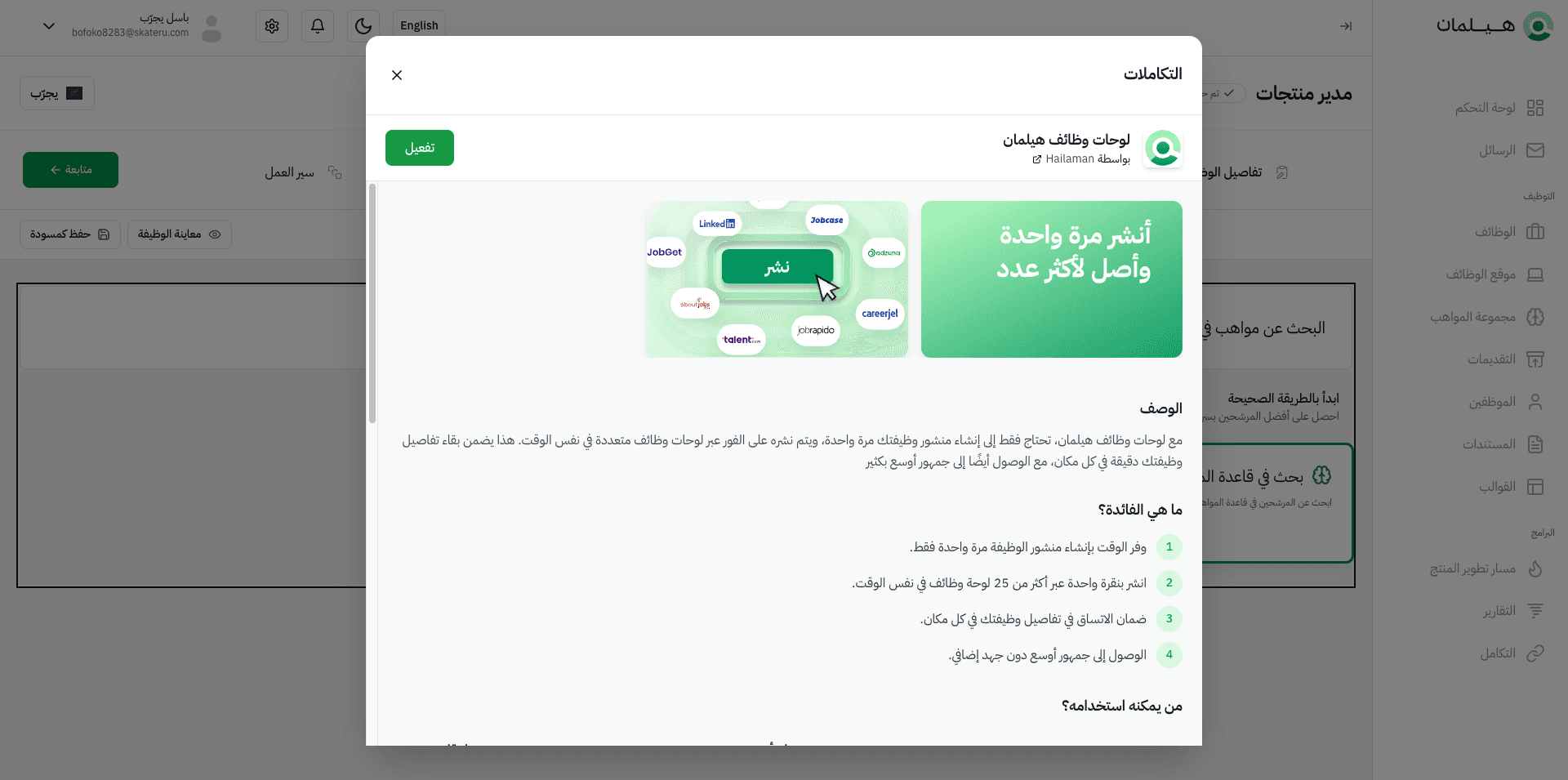 عند قيامك بالنقر على “نشر الوظائف على لوحة الوظائف” فإنه ستظهر لديك صفحة التكاملات لتقوم بقراءتها ومعرفة جميع المنصات التي يتم النشر خلالها ومن ثم القيام بتفعيل التكامل