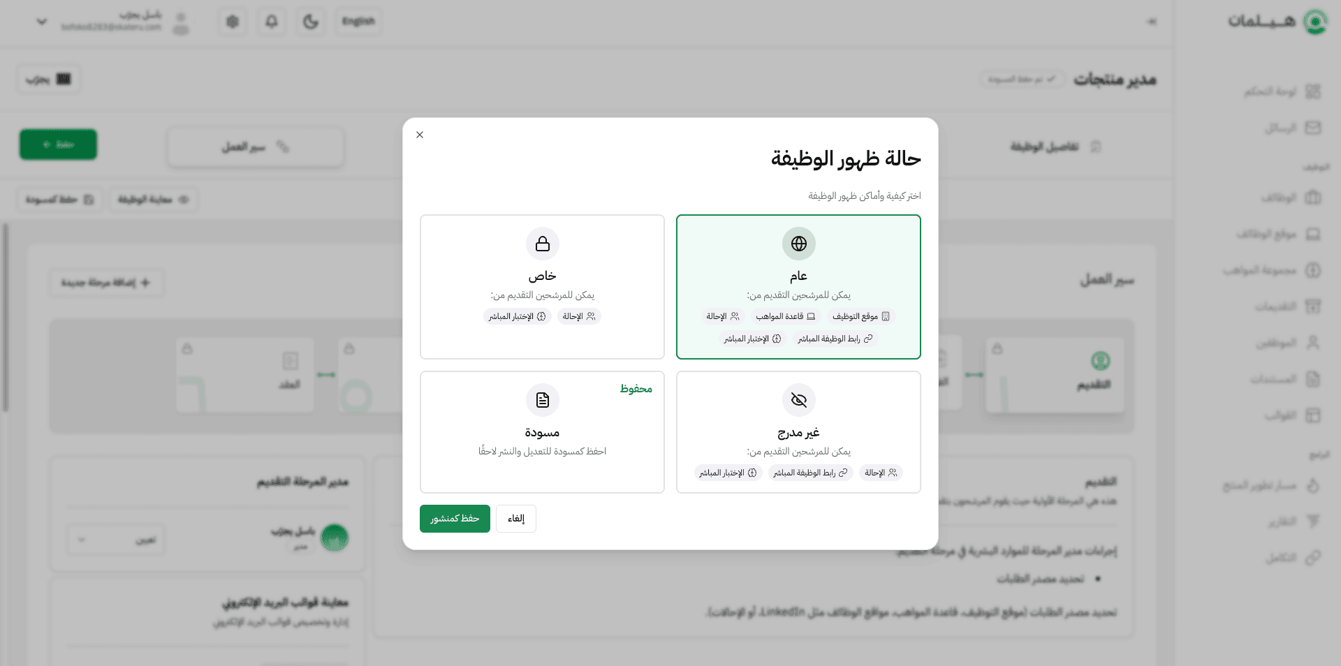 ستظهر هذه الواجهة لتحديد حالة الوظيفة سواء كنت تريد نشرها أو إبقاءها كمسودة أو جعلها غير مدرجة وغيرها من الخيارات