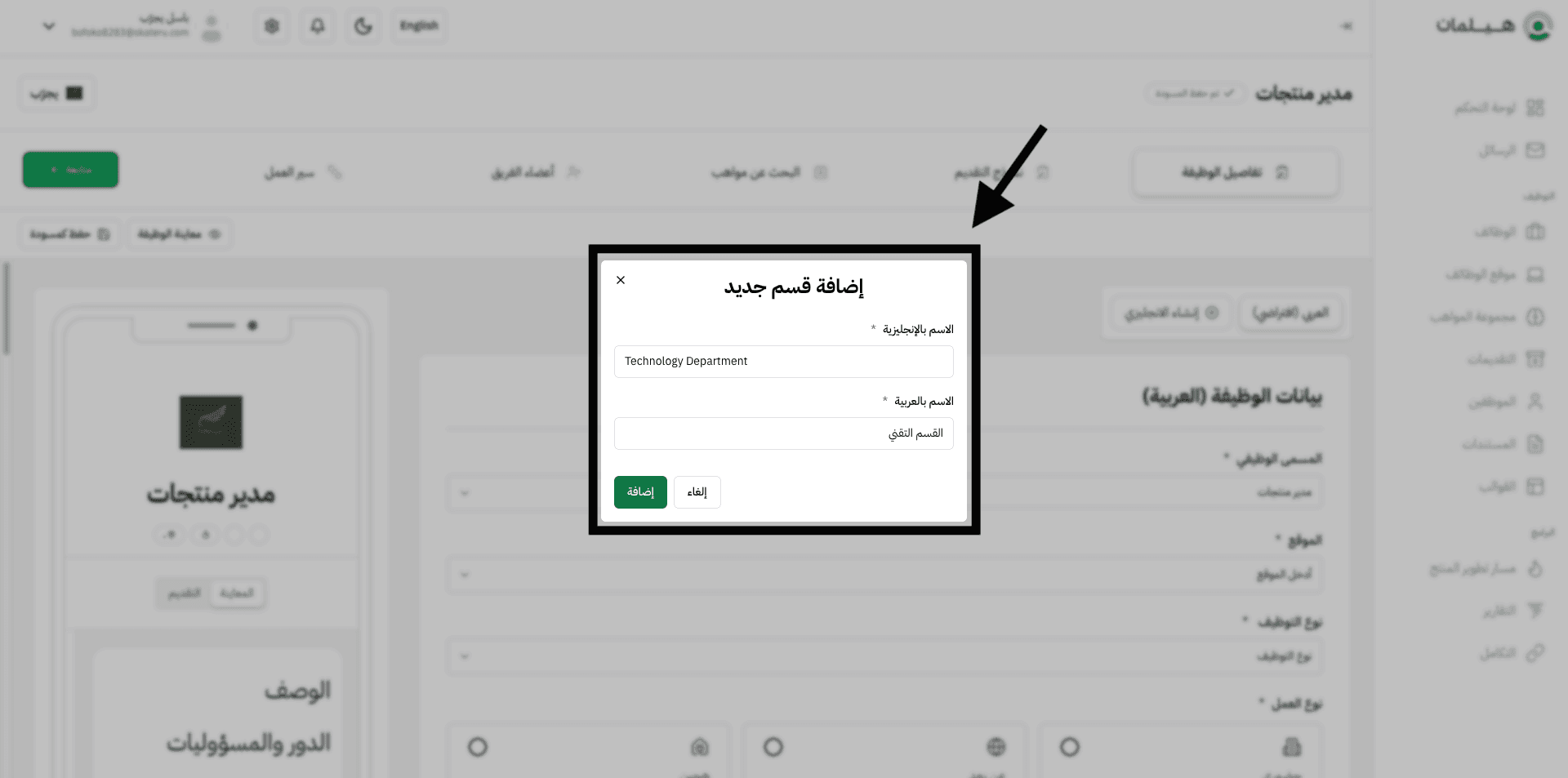 من هنا تقوم بتعبئة القسم الخاص بهذه الوظيفة ويمكنك إنشاء أقسام جديدة حسب أقسام الشركة ومتطلباتها
