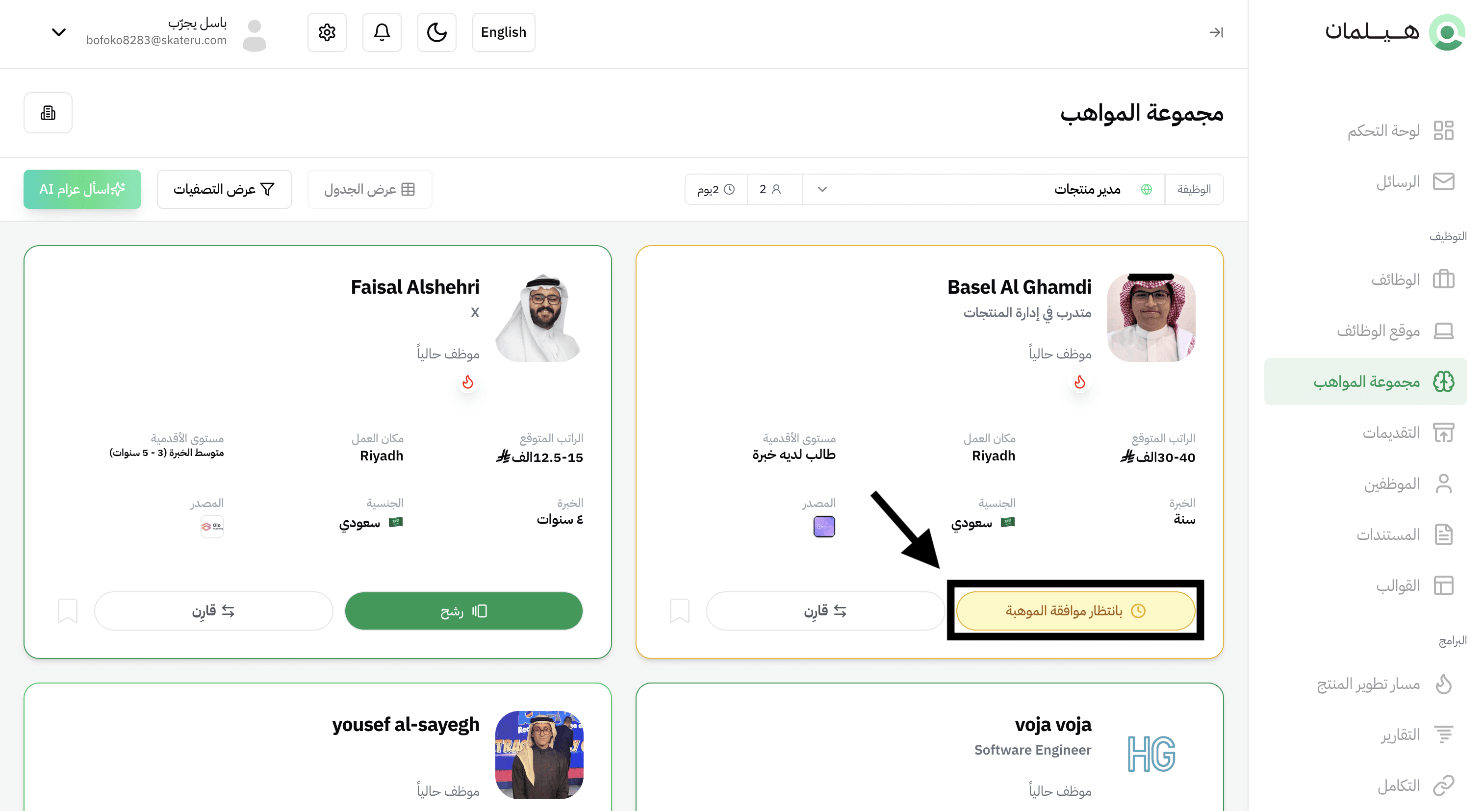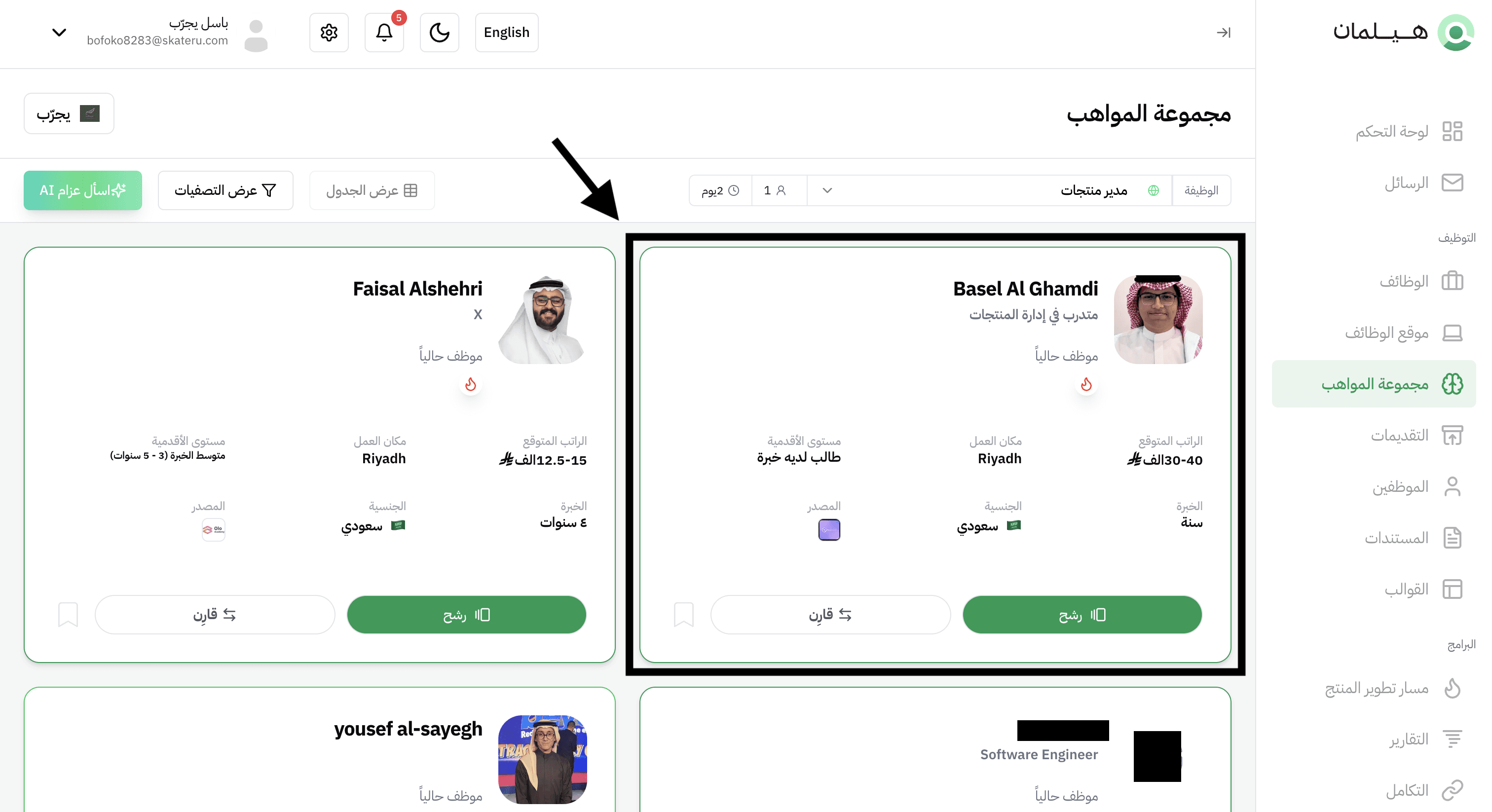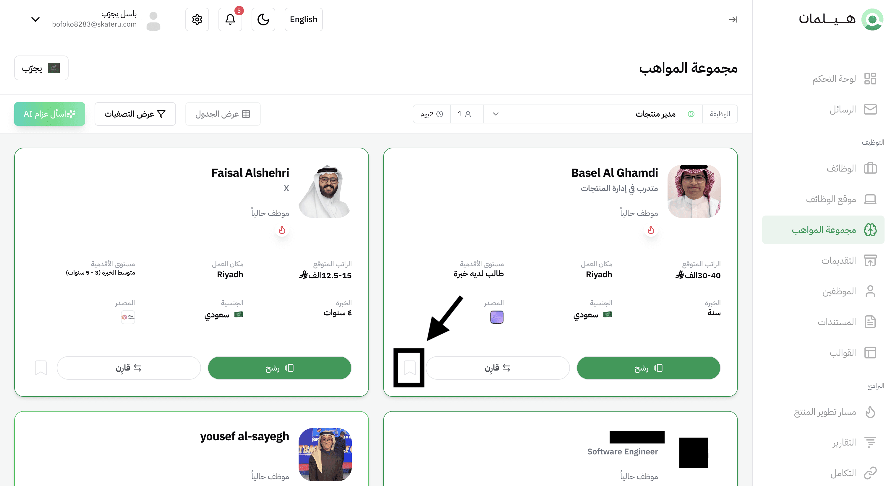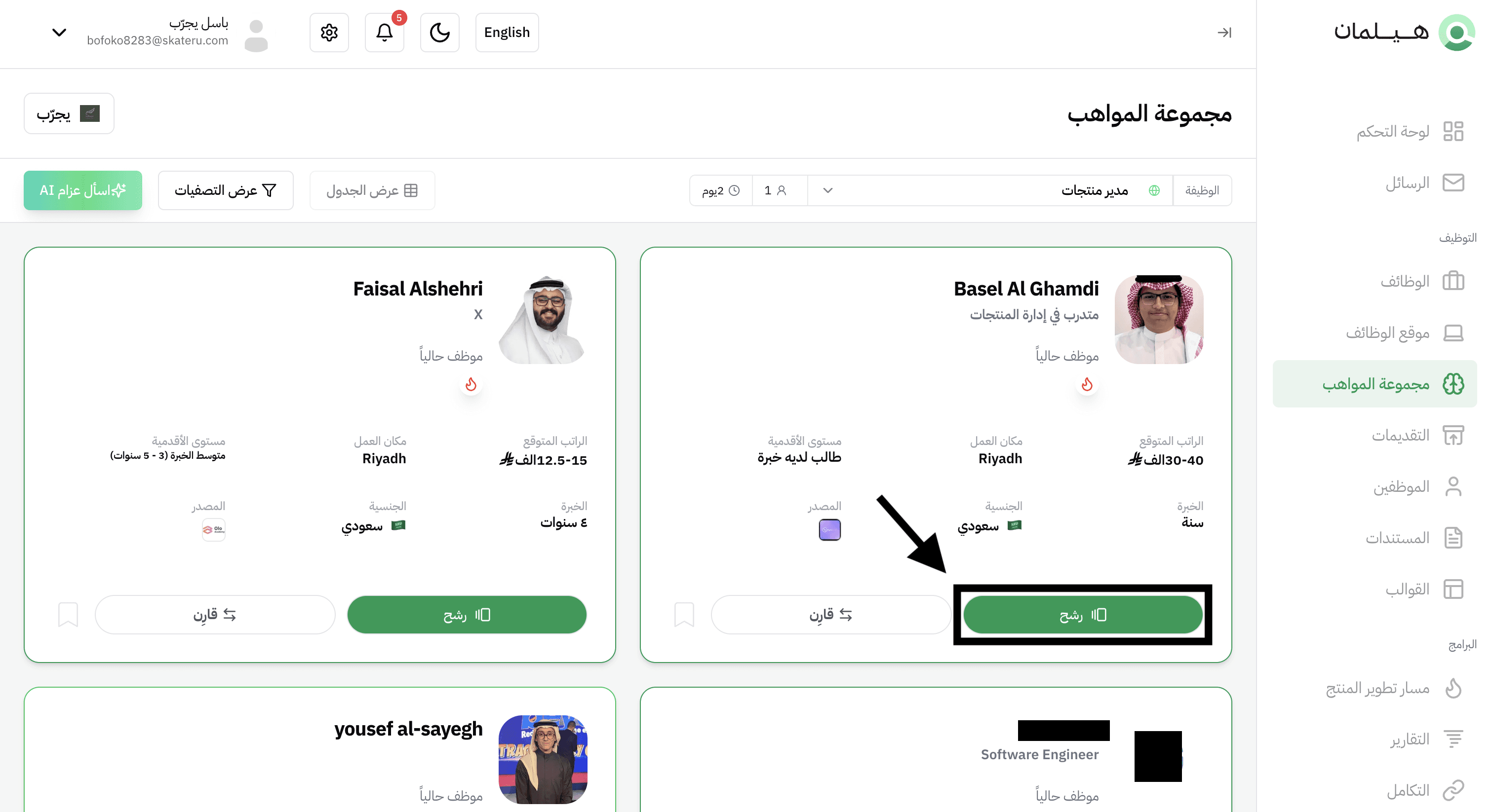 في حال أحببت استقطاب أحد المواهب لديك في الشركة، فكل ماعليك فعله هو القيام بالنقر على “رشّح” ليصل بريد إلكتروني للموهبة ليقوم بدوره بقبول الفرصة أو رفضها