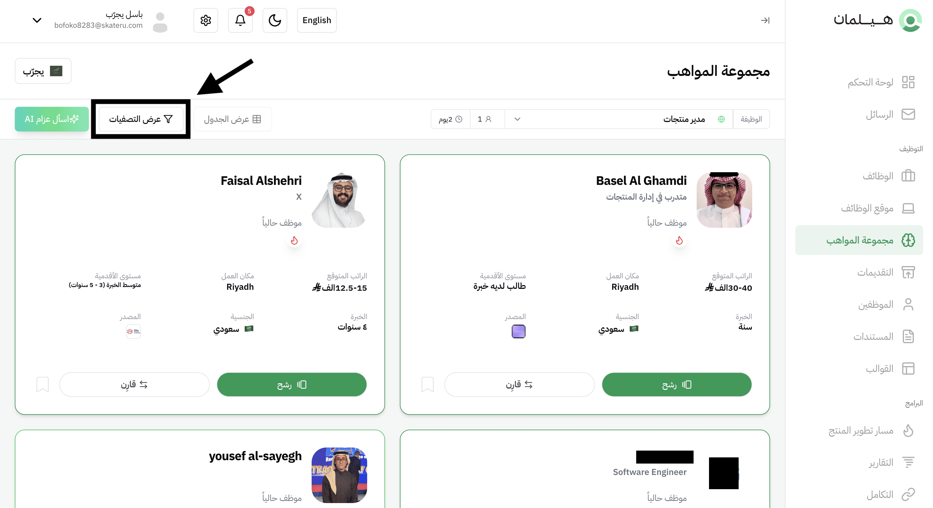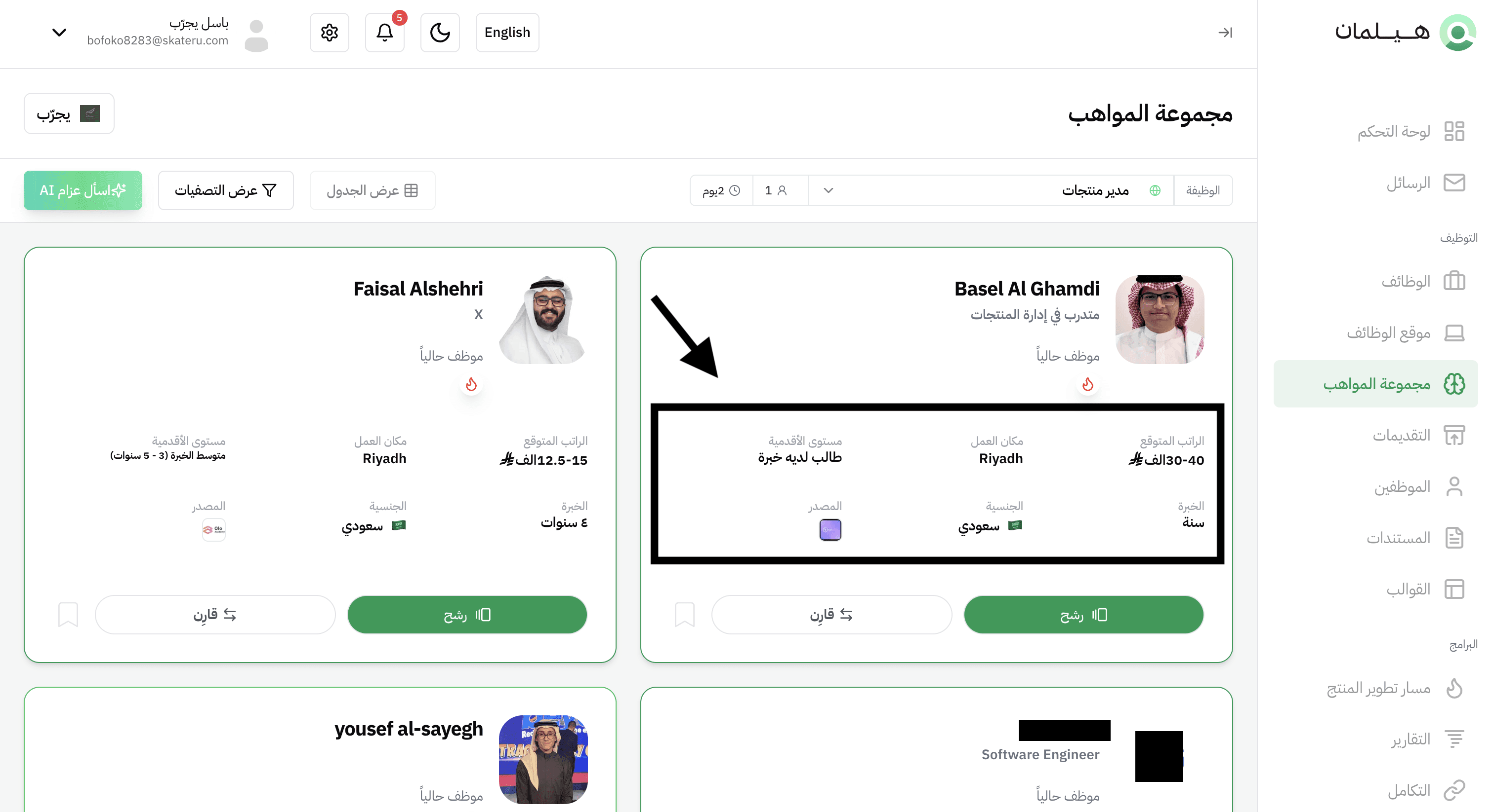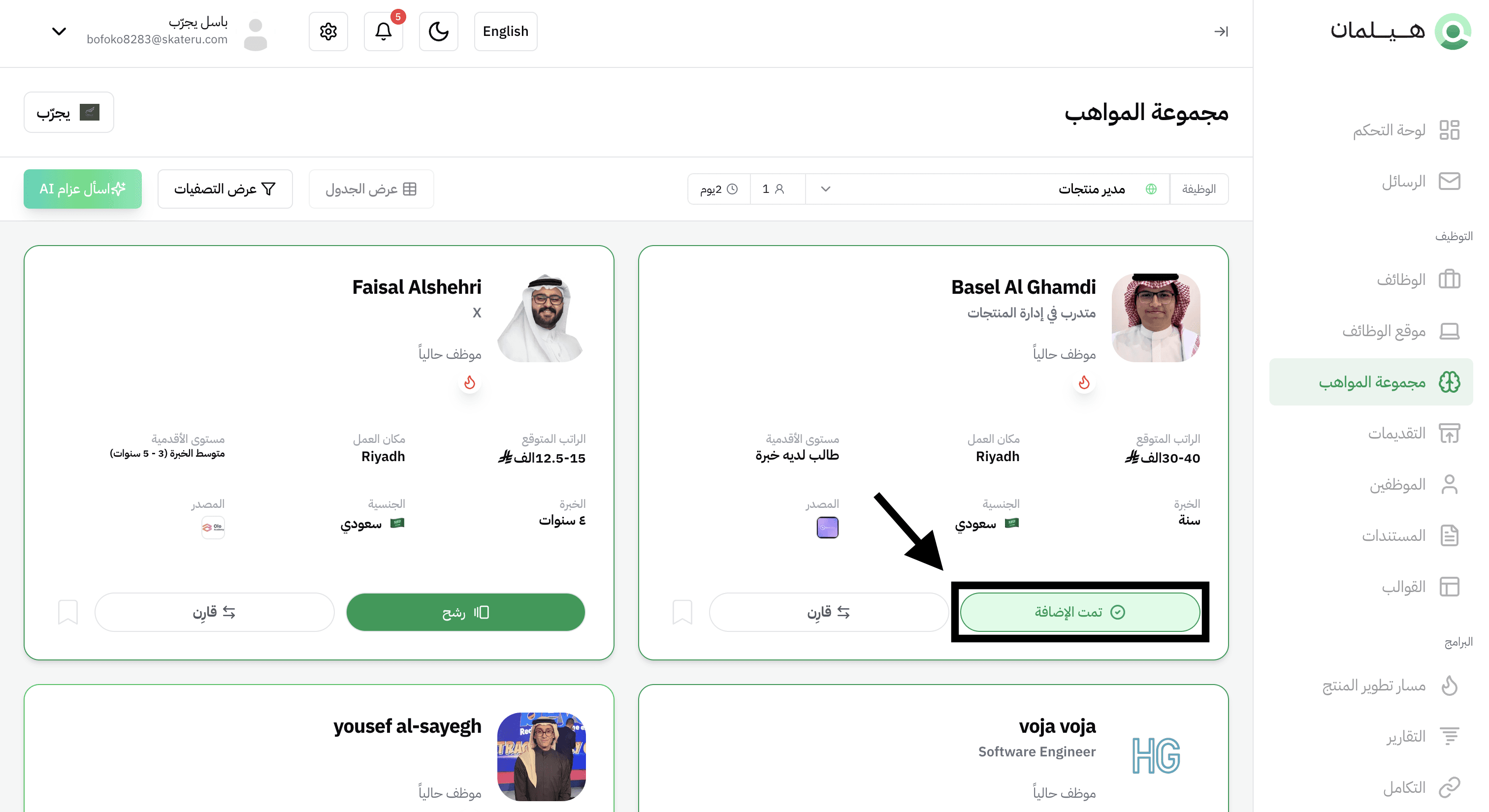 في حال أحببت استقطاب أحد المواهب لديك في الشركة، فكل ماعليك فعله هو القيام بالنقر على “رشّح” ليصل بريد إلكتروني للموهبة ليقوم بدوره بقبول الفرصة أو رفضها
