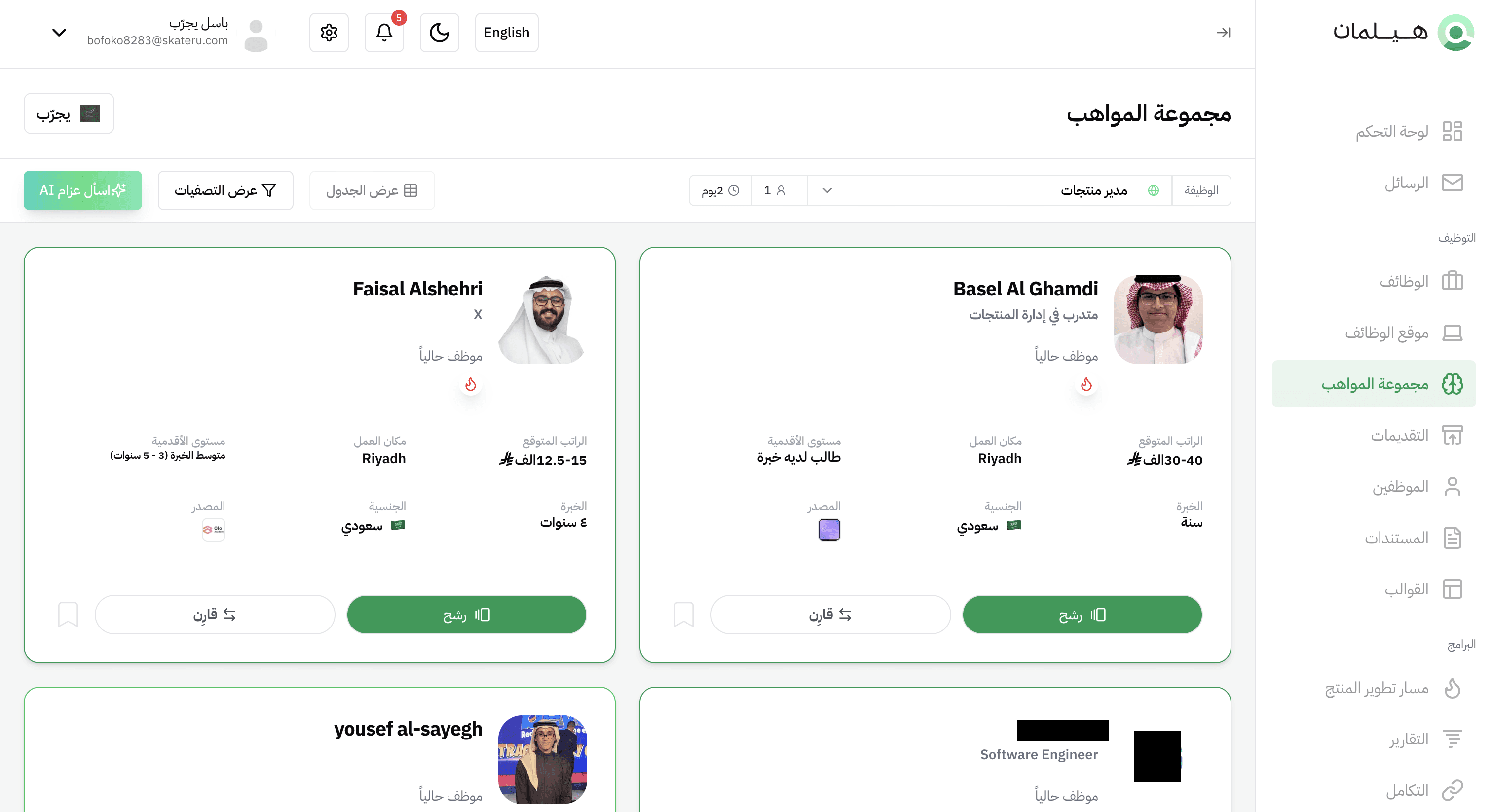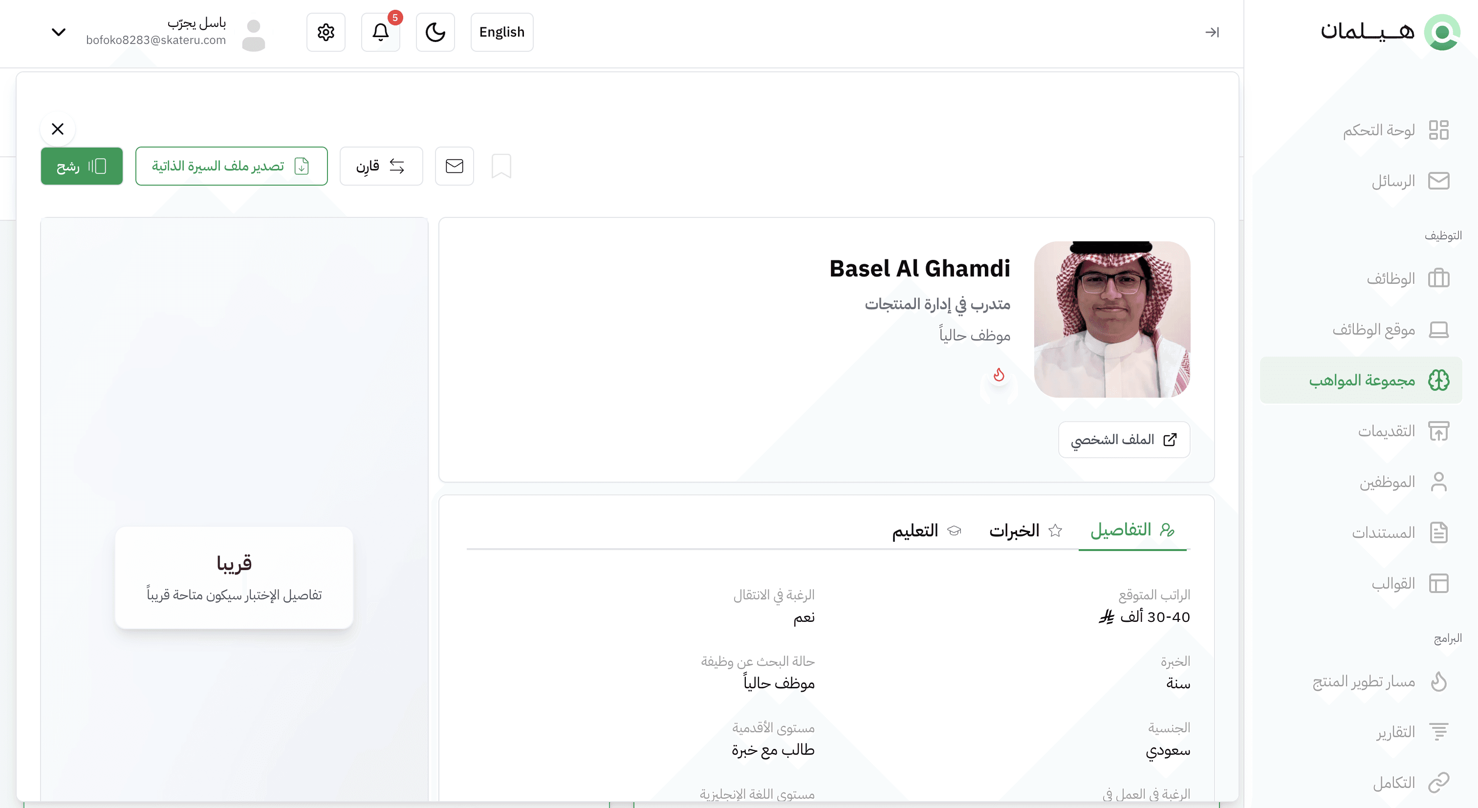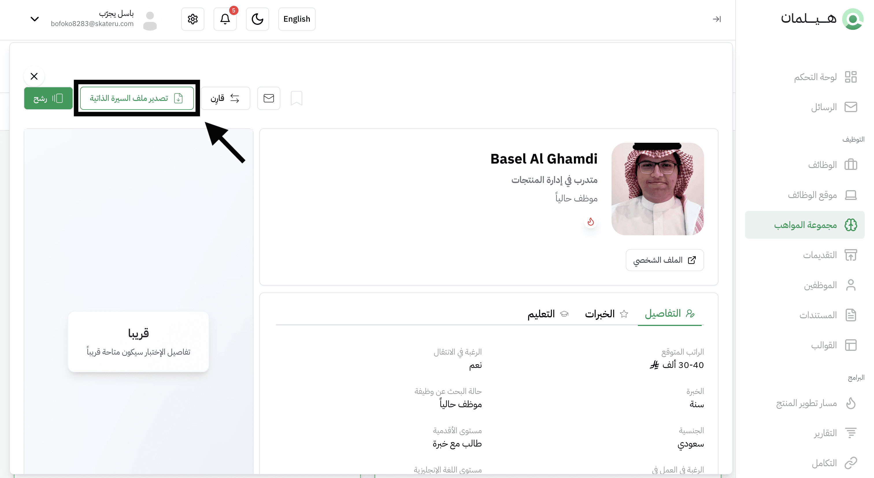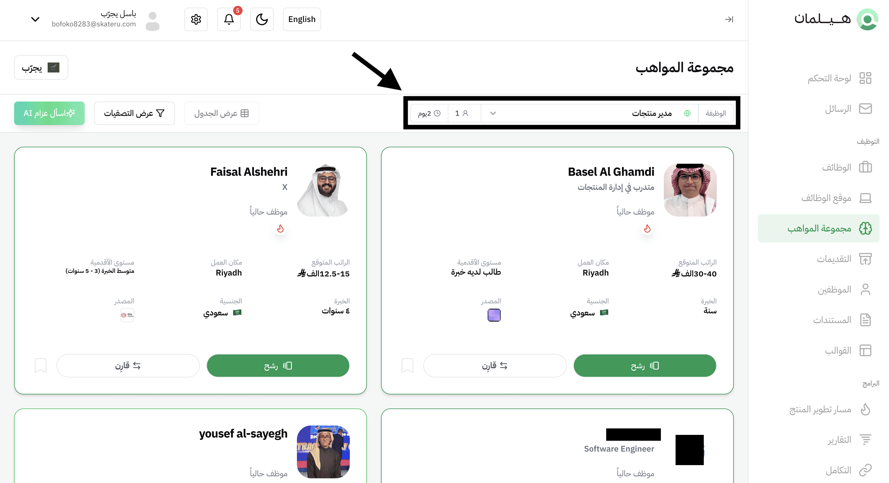 في حال أحببت استقطاب أحد المواهب لديك في الشركة، فكل ماعليك فعله هو القيام بالنقر على “رشّح” ليصل بريد إلكتروني للموهبة ليقوم بدوره بقبول الفرصة أو رفضها