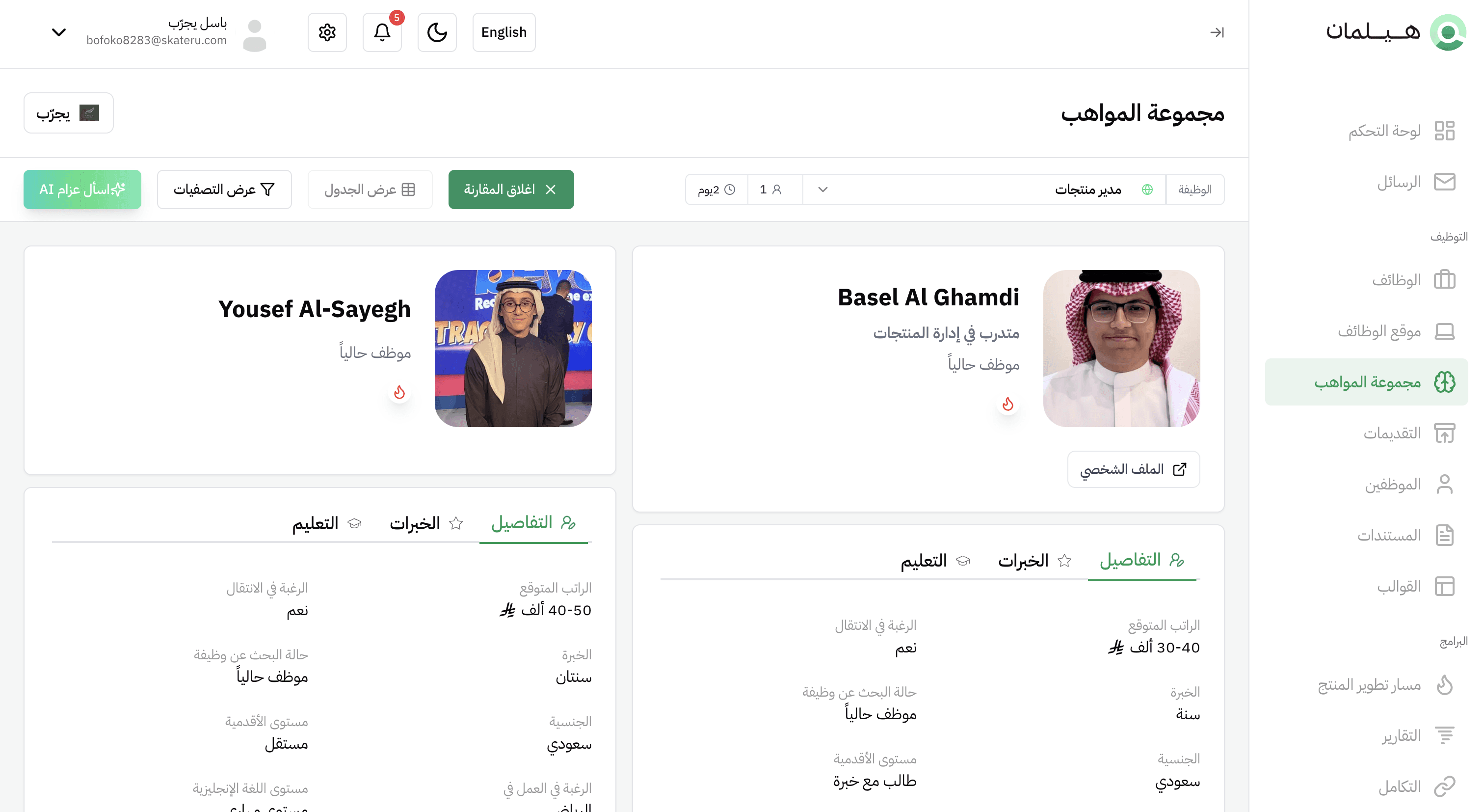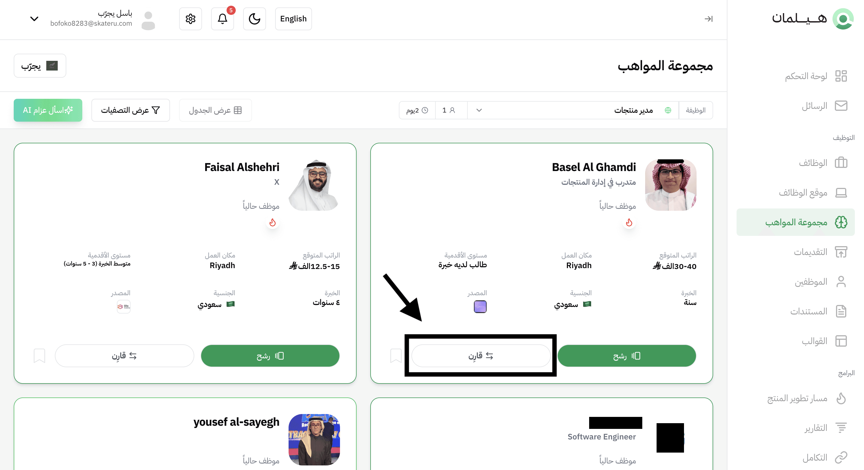 من خلال النقر على “قارِن” يمكنك القيام بمقارنة موهبة مع الأخرى لتستطيع رؤية الفروقات بينهم ومن منهم الأكثر ملاءمة للوظيفة