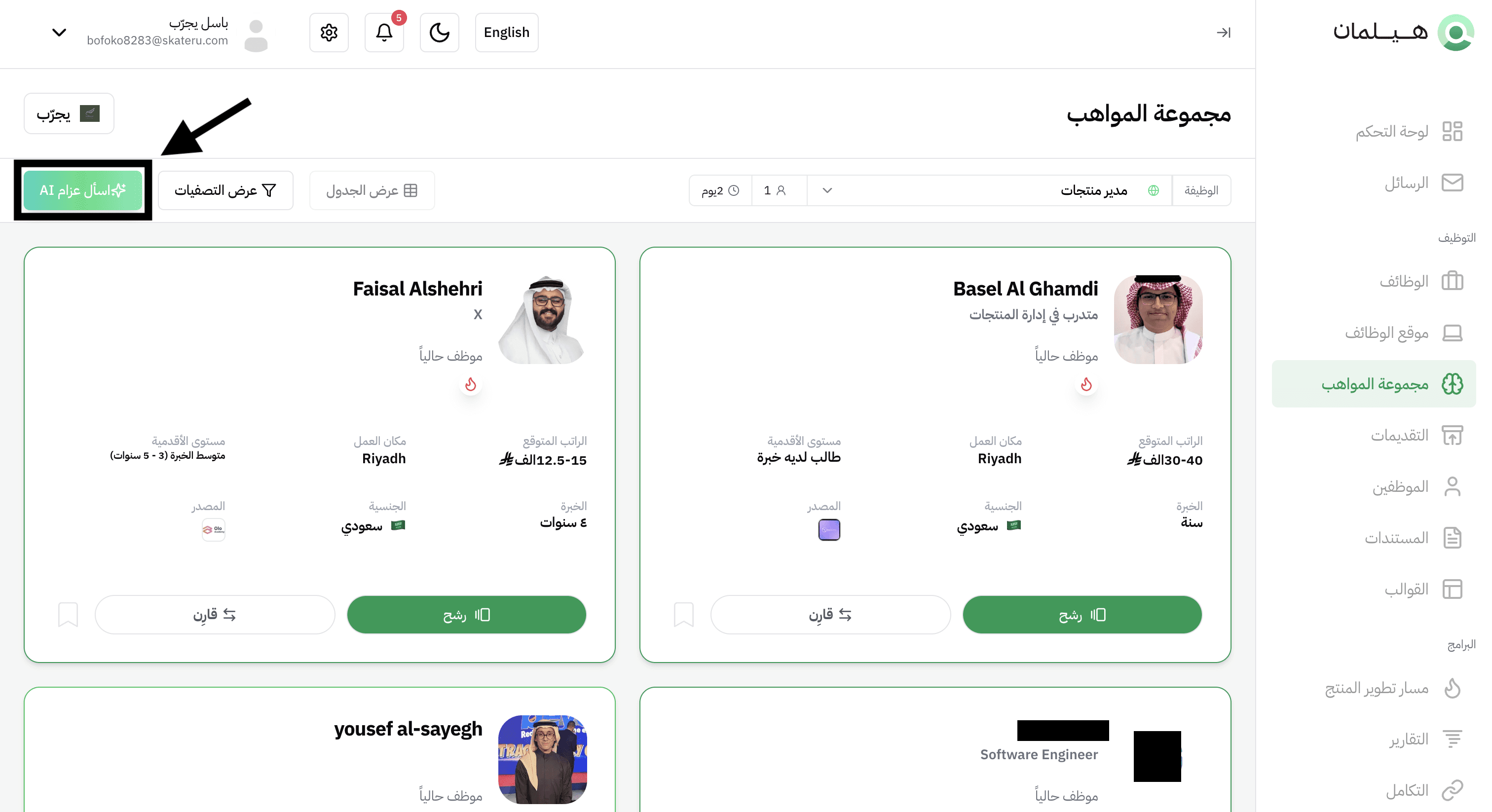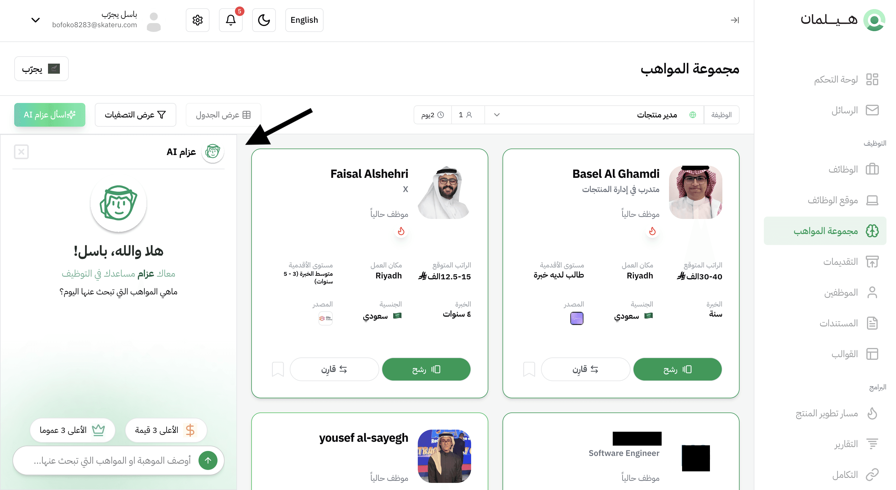 يمكنك ايضًا من خلال النقر على “اسأل عزّام” أن تستعمل الذكاء الإصطناعي “عزّام” داخل المنصة وذلك لتسأله عن أكثر المواهب المناسبة حسب احتياجات الشركة