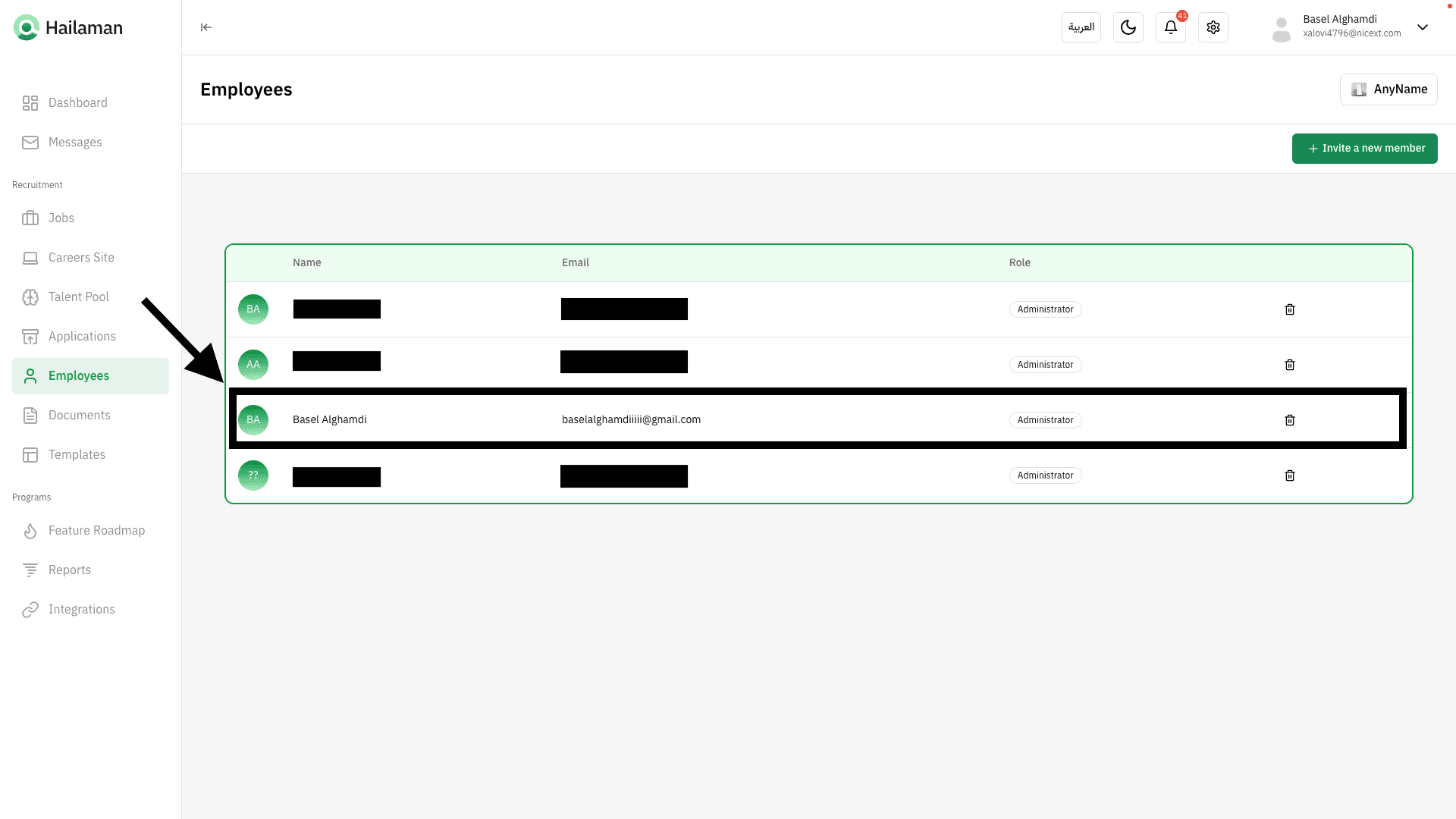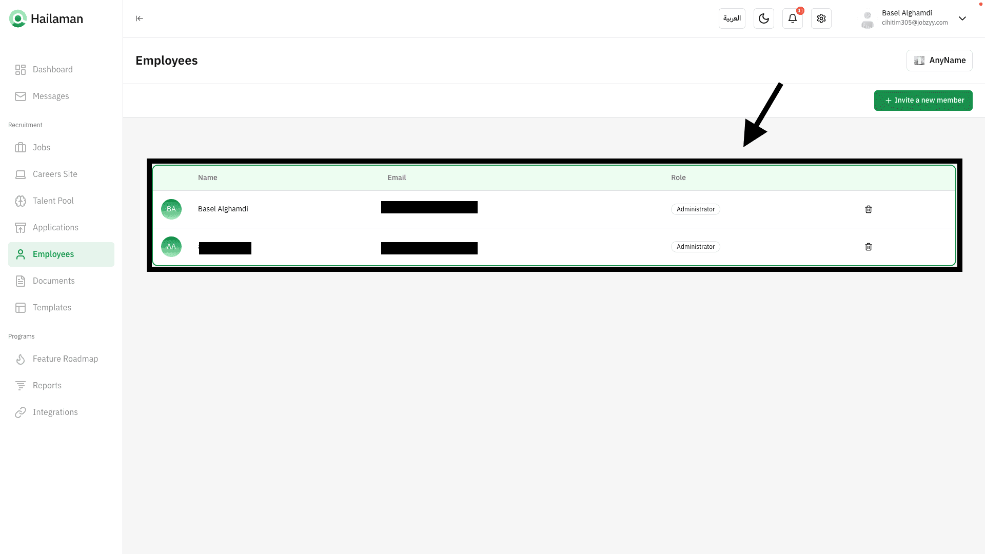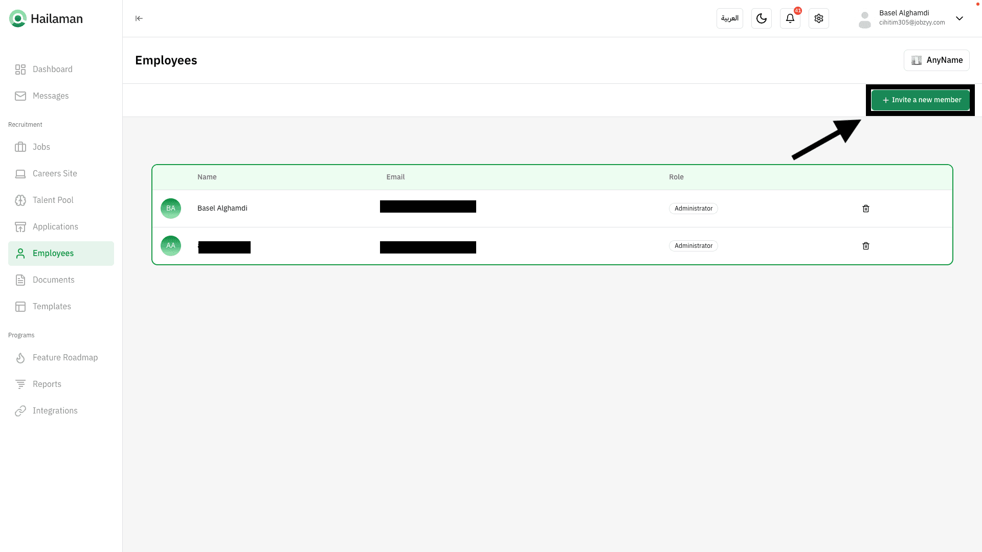 You can add a new employee by clicking on “Invite New Member” at the top.