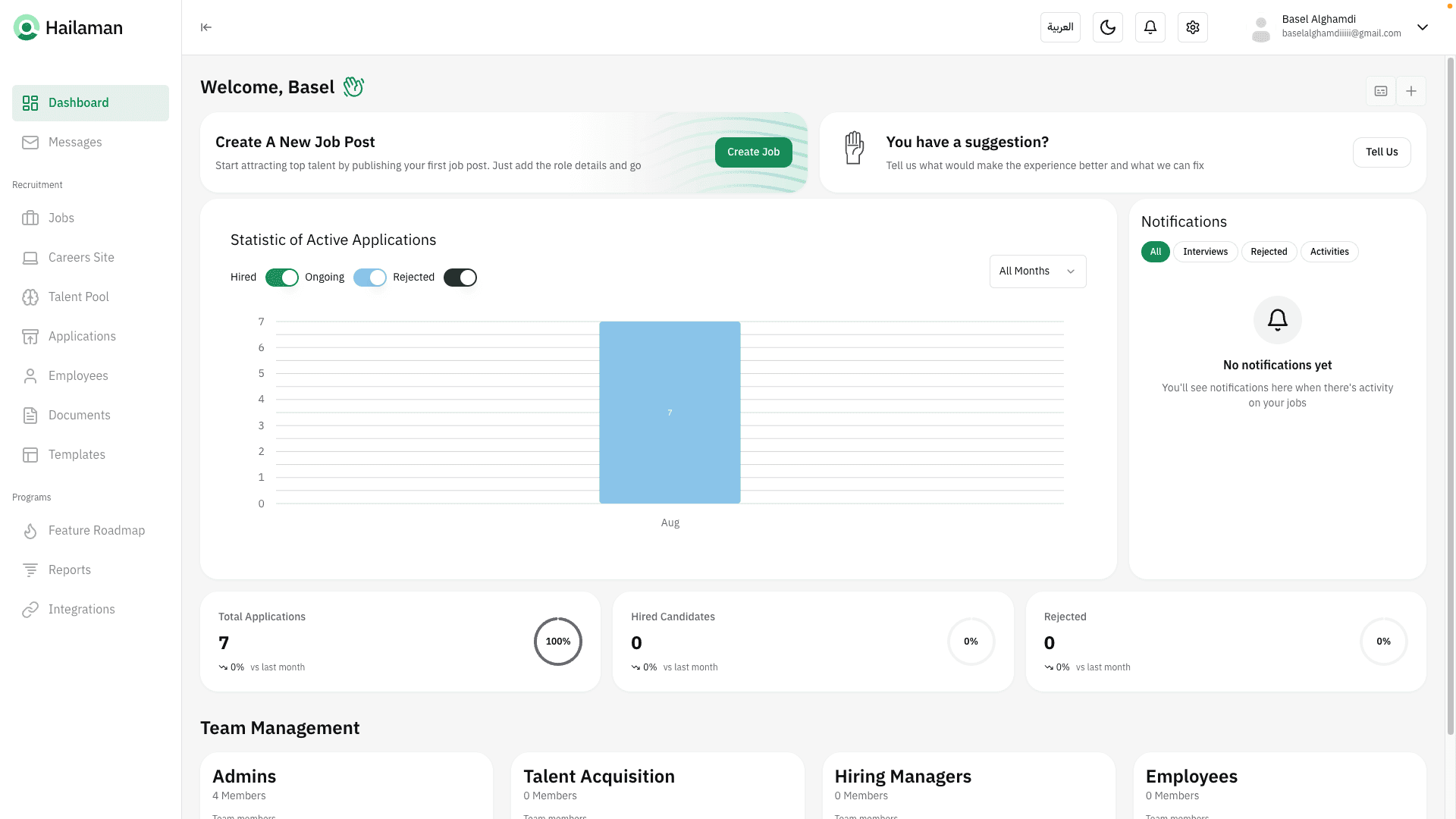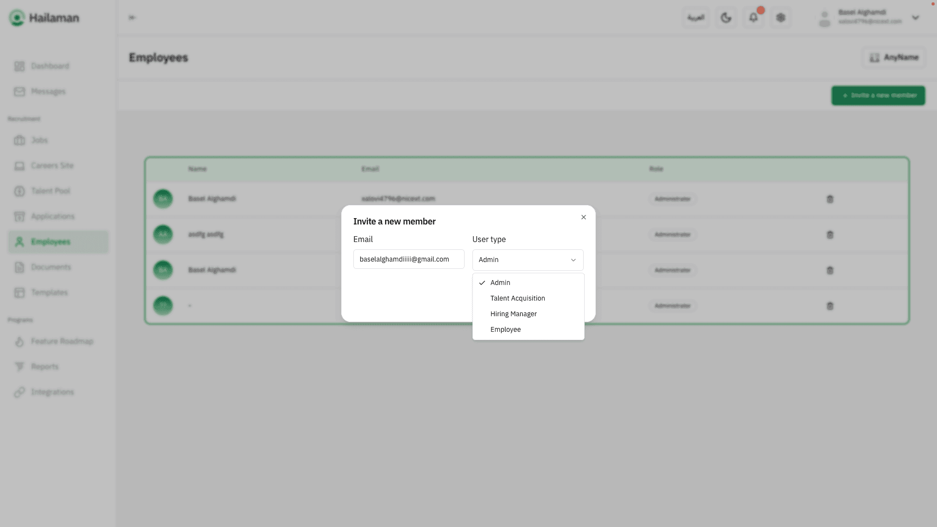 From the dropdown menu, you can choose the employee’s permission type: “Admin”, “Talent Acquisition”, “Hiring Manager”, or “Employee”, each with its own specific access rights.