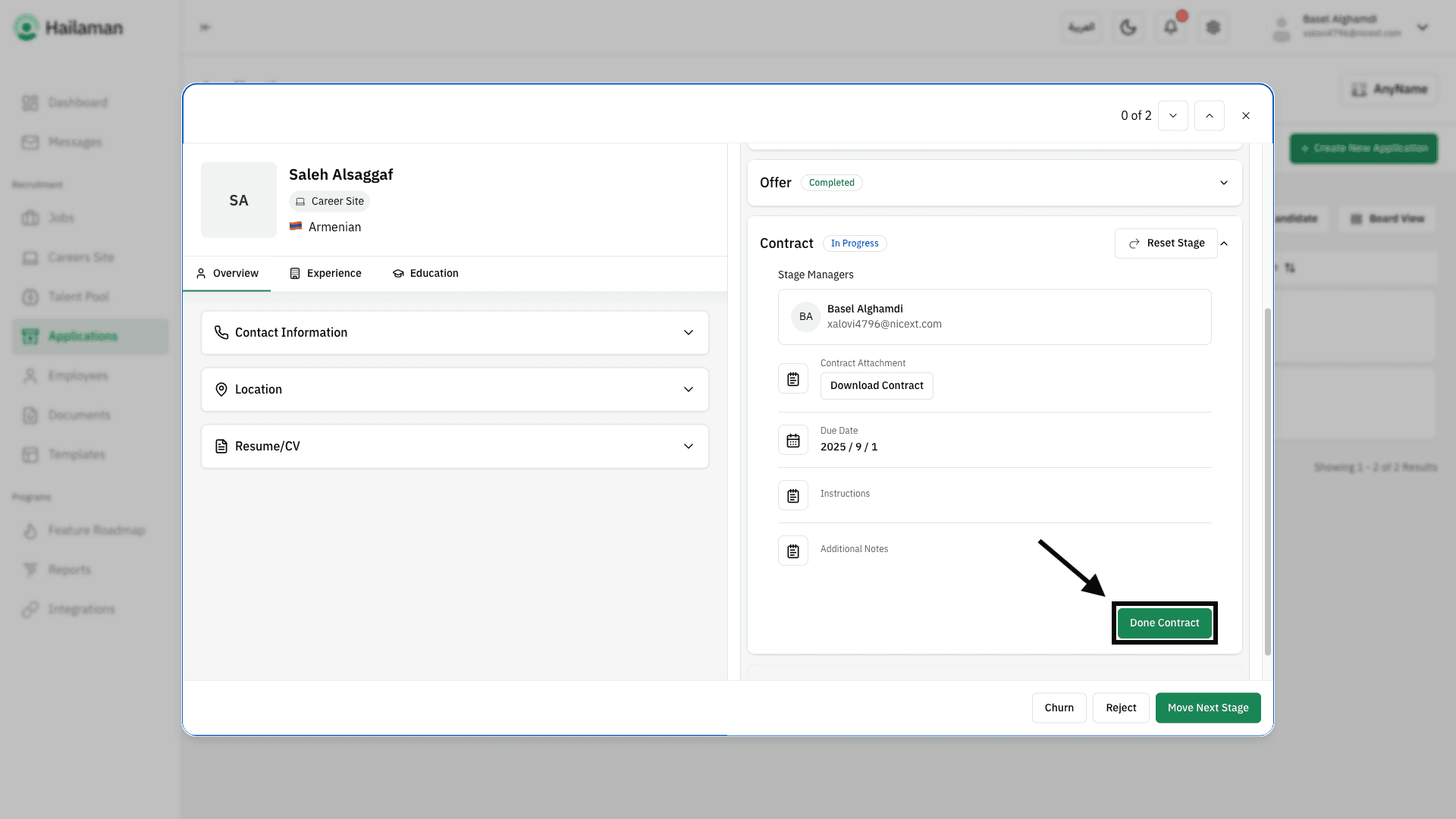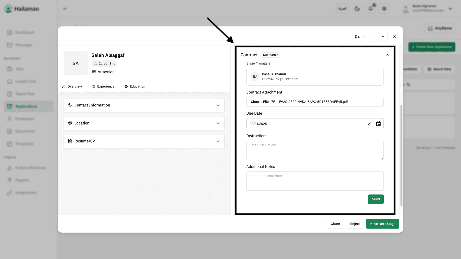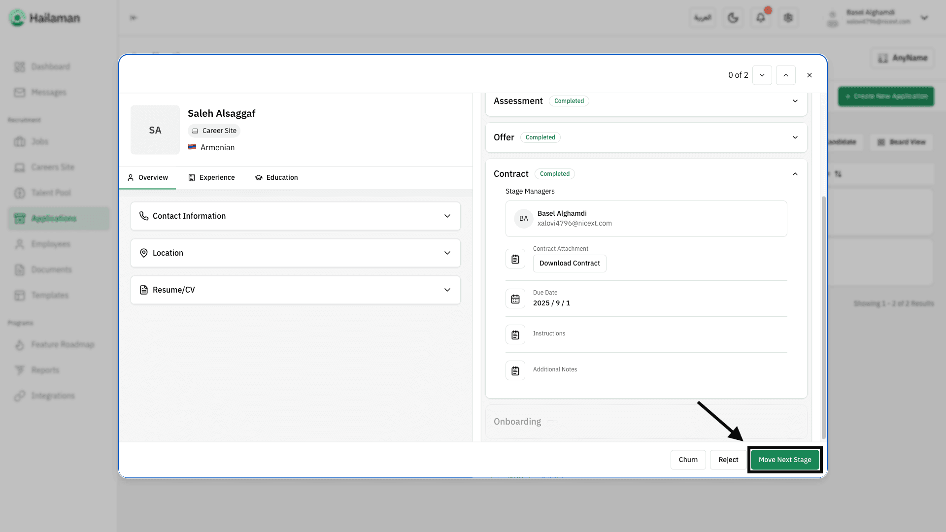 Then, by clicking on “Move Next Stage”, you can move the applicant from the “Contract” stage to the next stage.