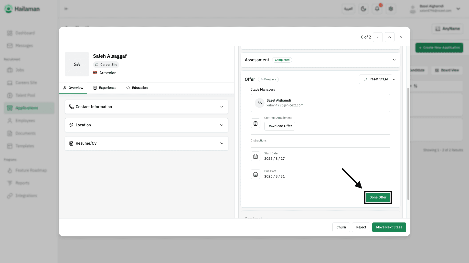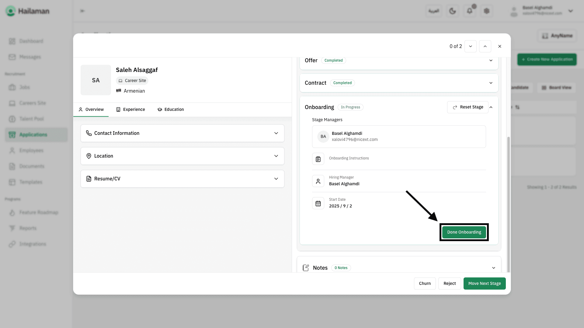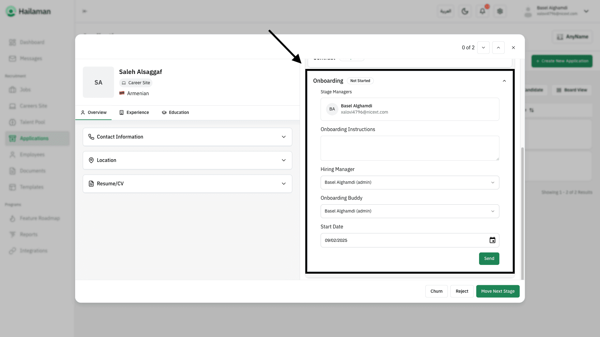 Then, by clicking on “Move Next Stage”, you can move the applicant from the “Contract” stage to the next stage.