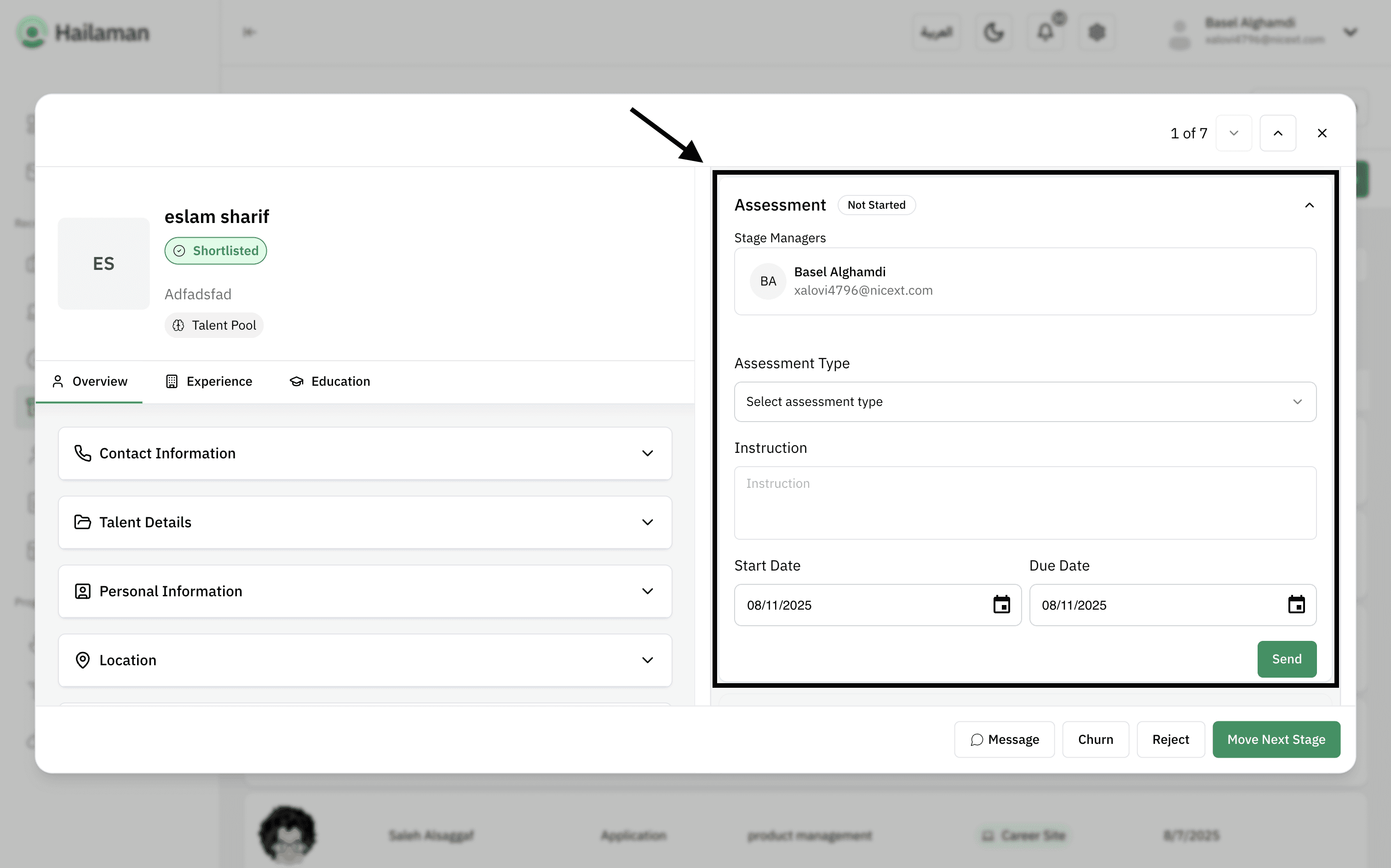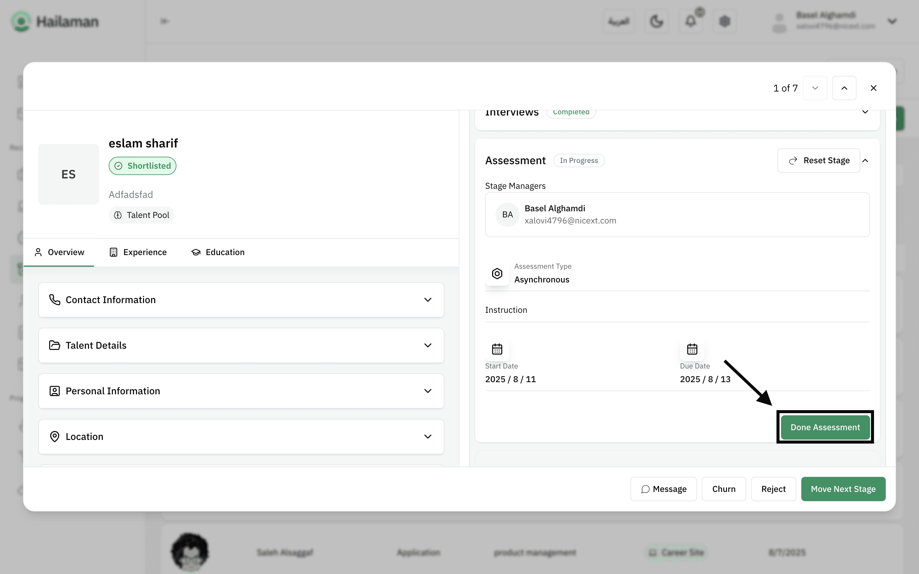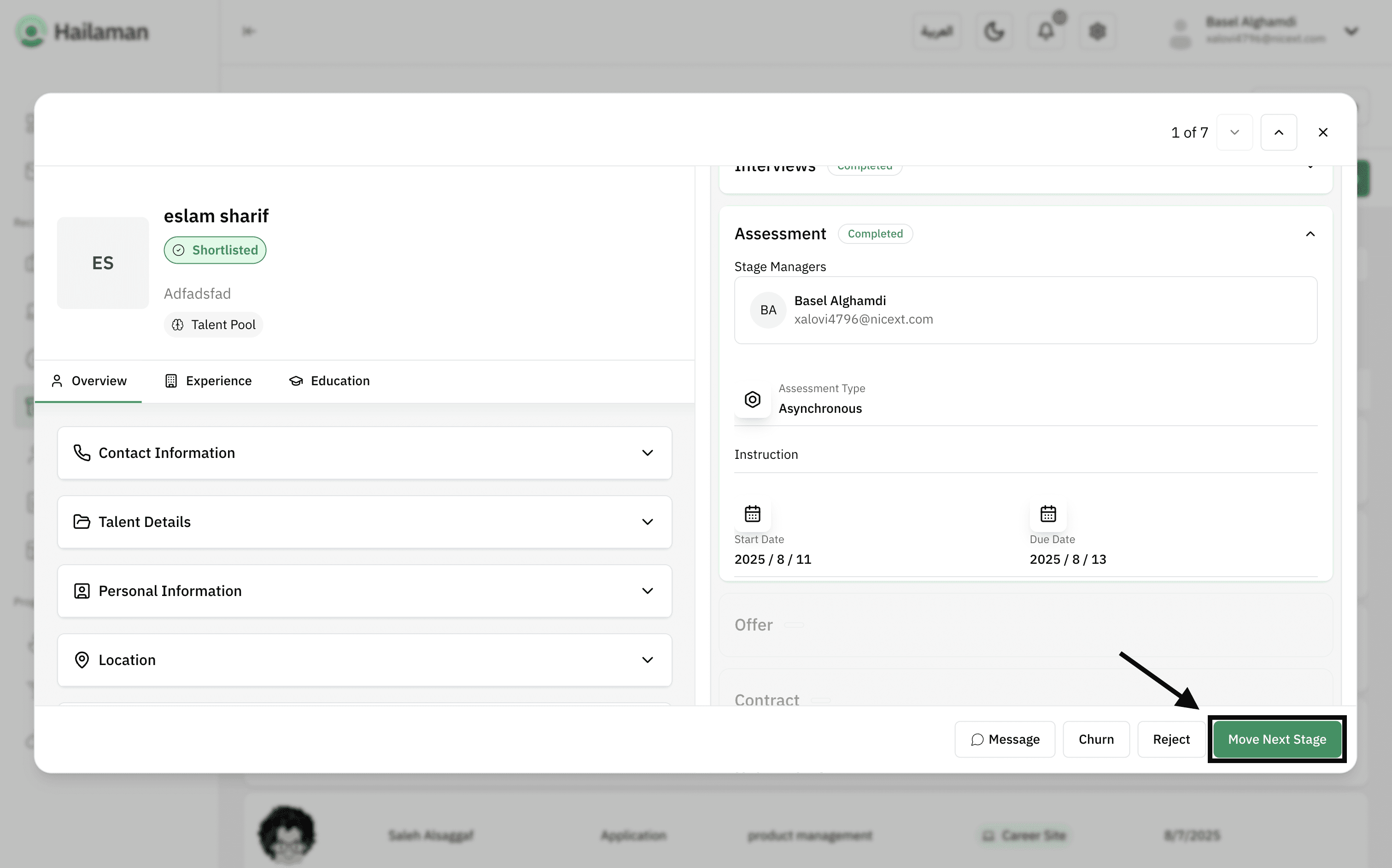 Then, by clicking on “Move Next Stage”, you can move the applicant from the “Assessment” stage to the next stage.