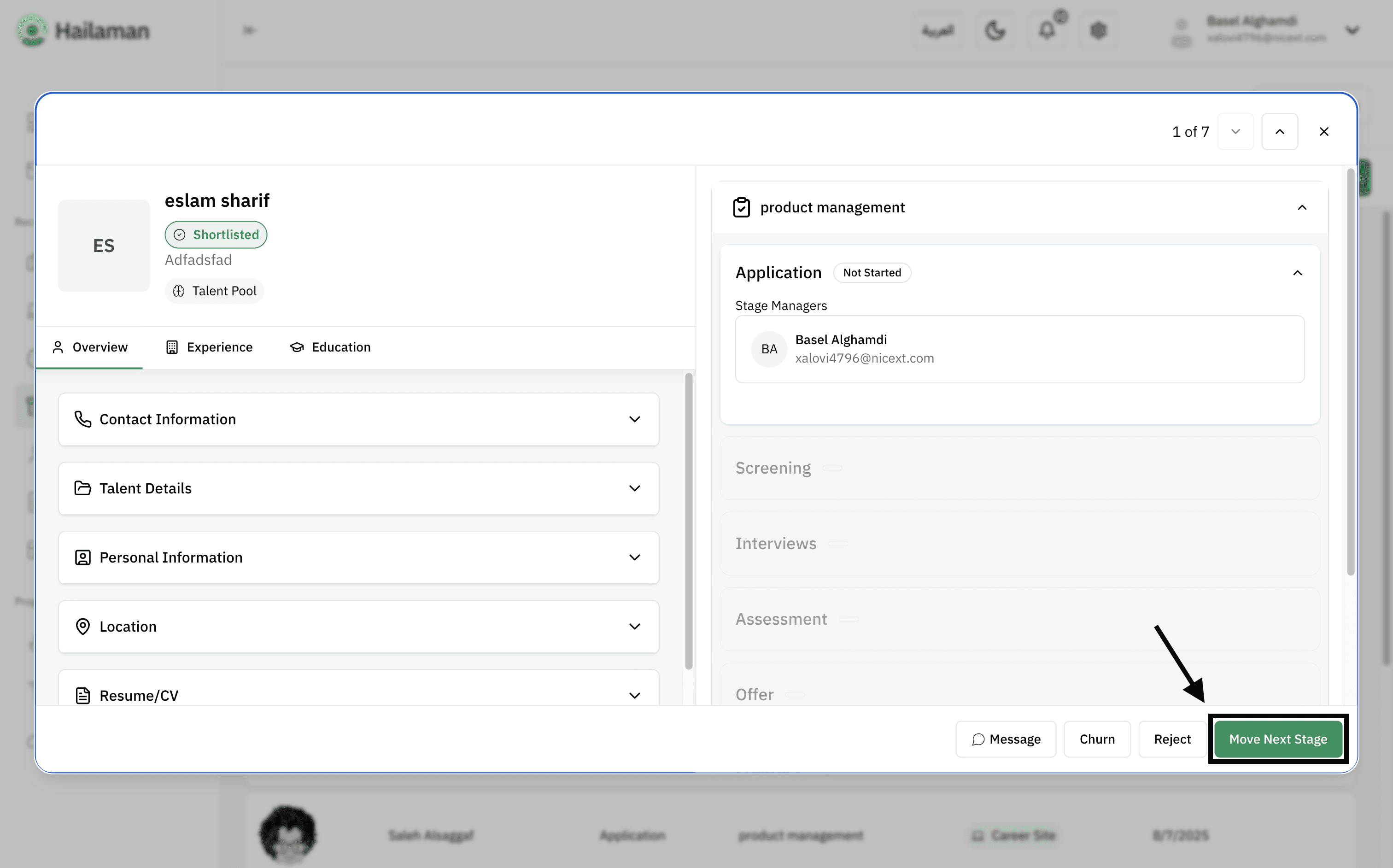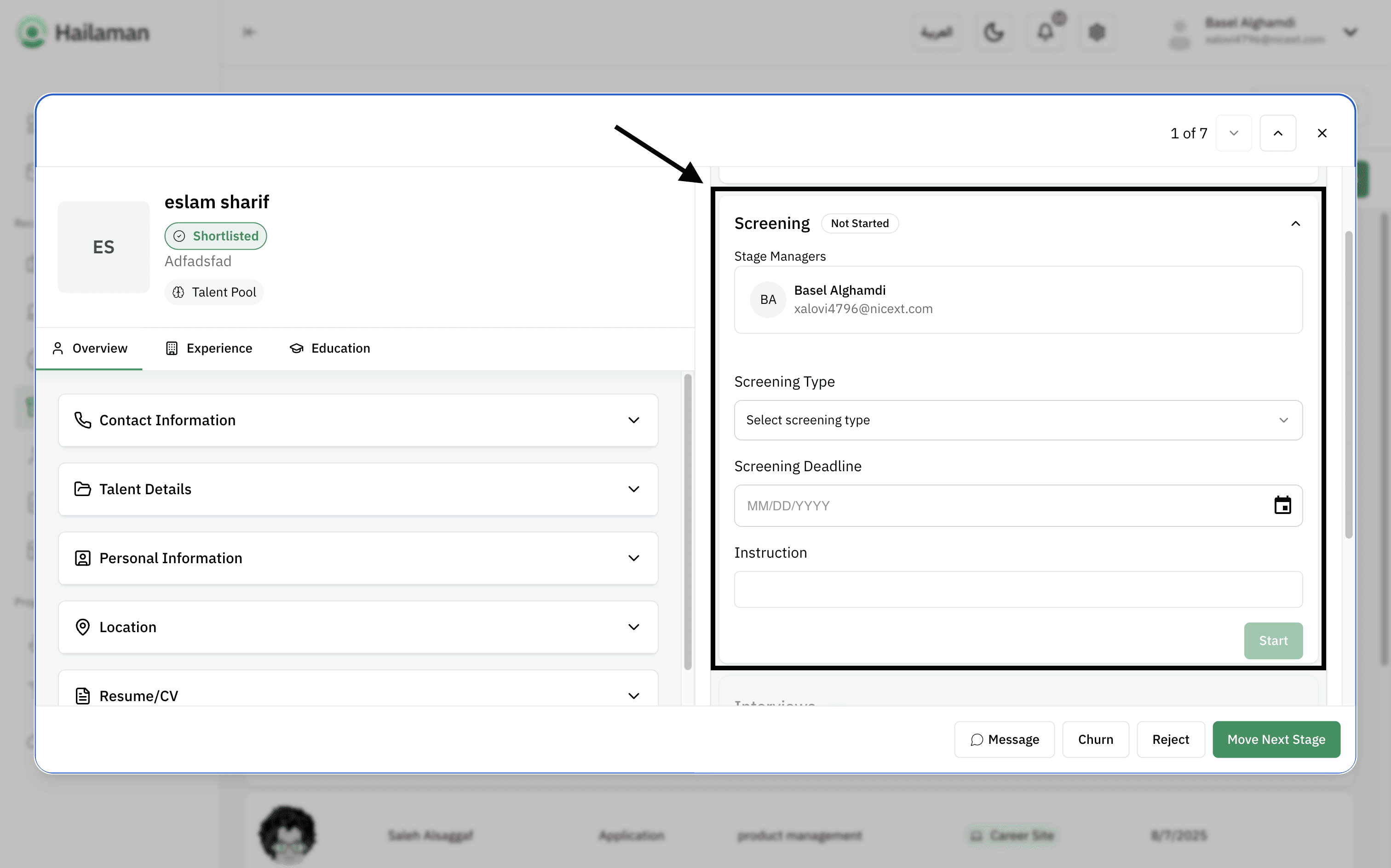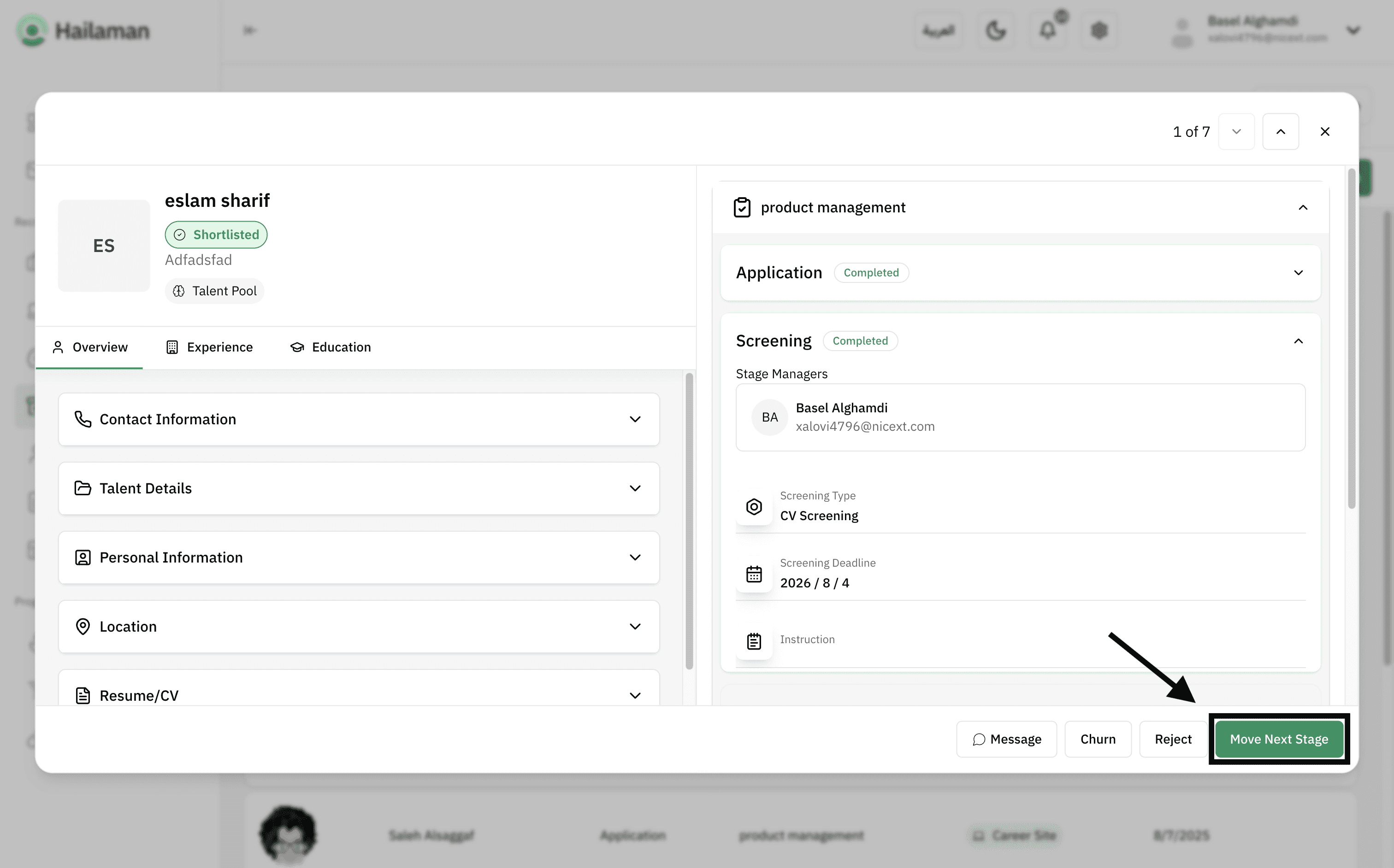 Then, by clicking on “Move Next Stage”, you can move the applicant from the “Screening” stage to the next stage.