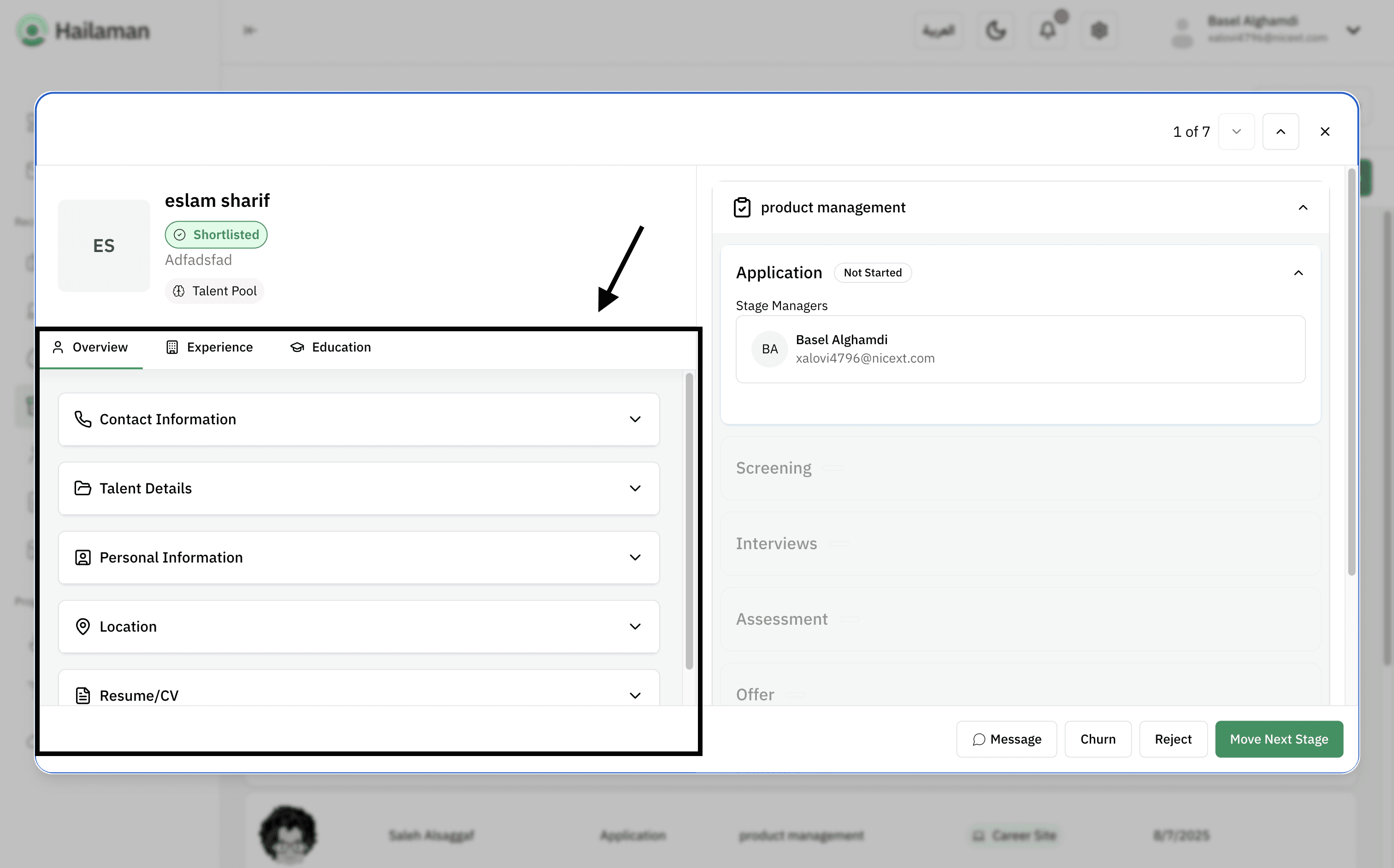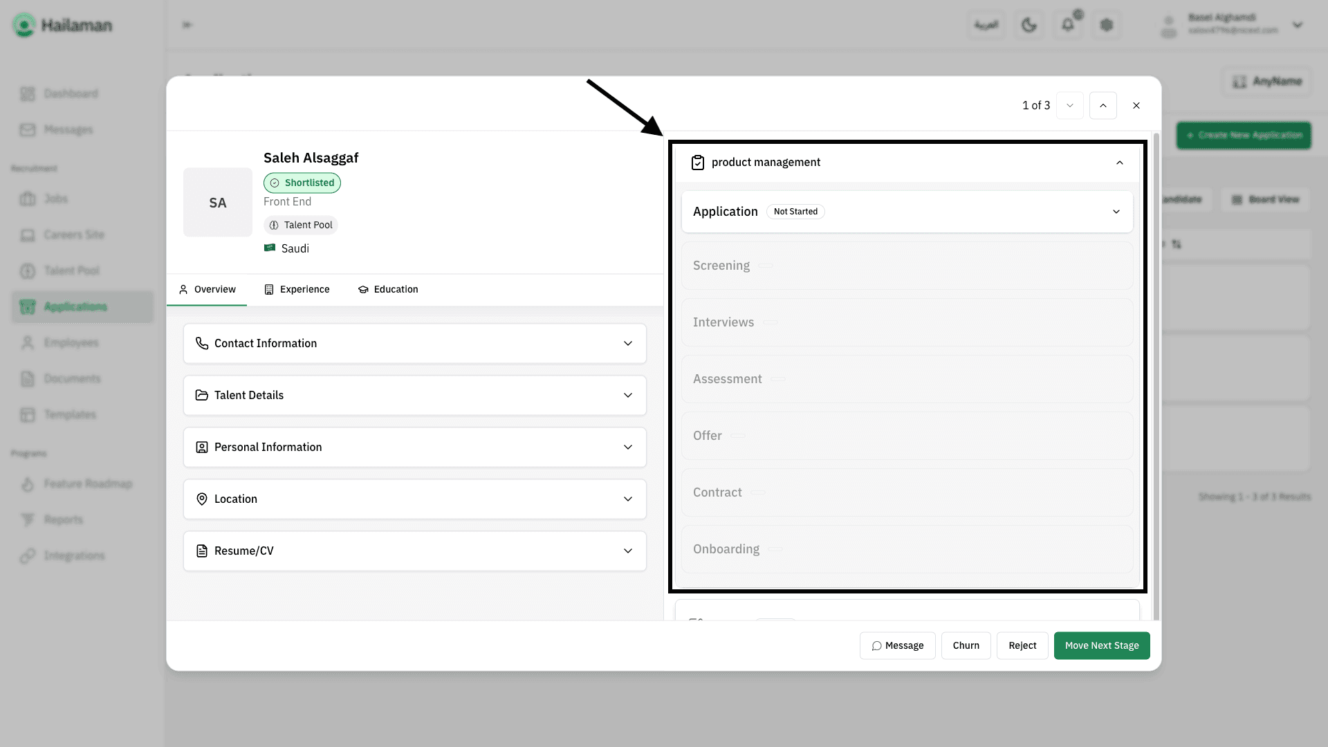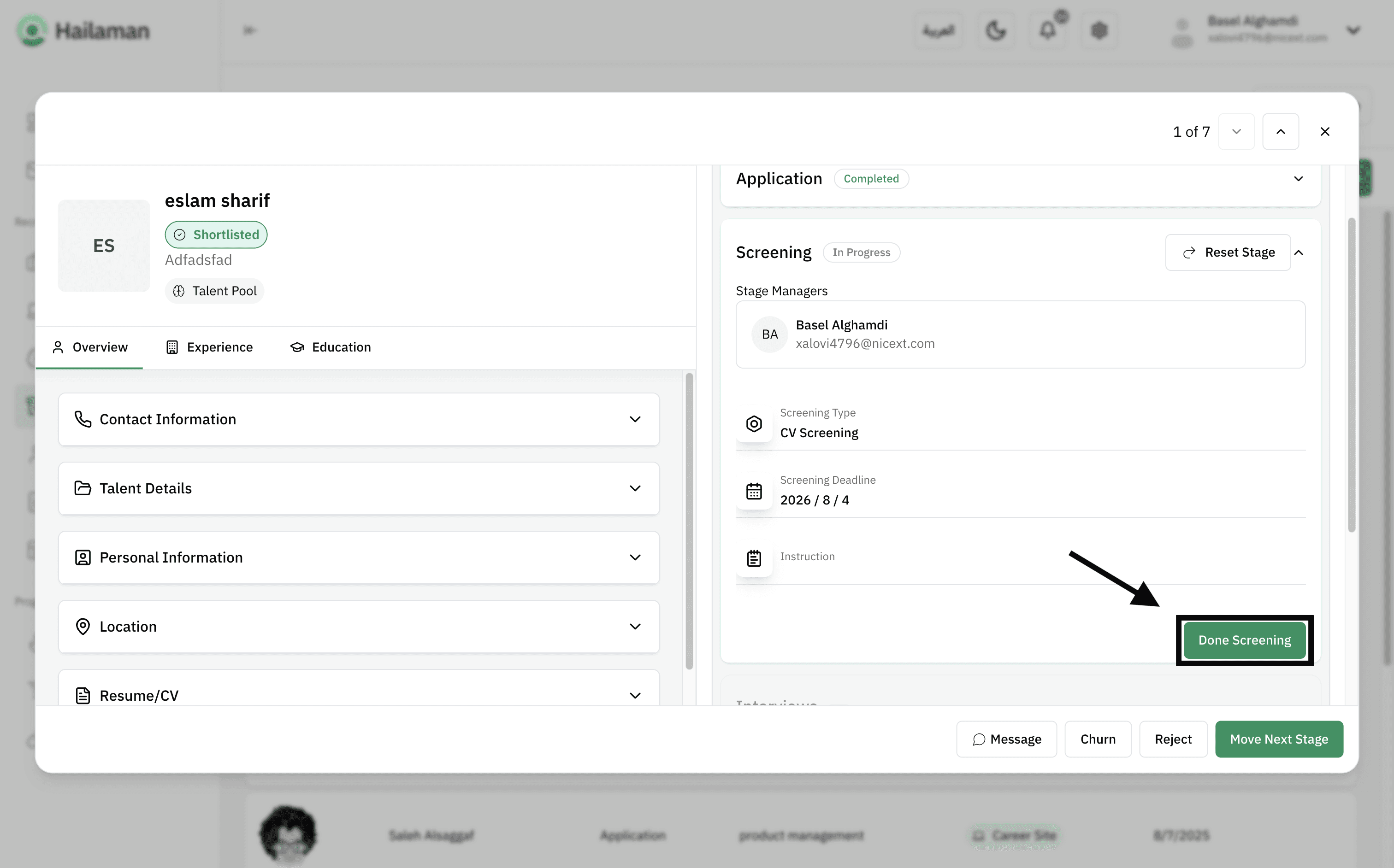 Then, by clicking on “Move Next Stage”, you can move the applicant from the “Screening” stage to the next stage.