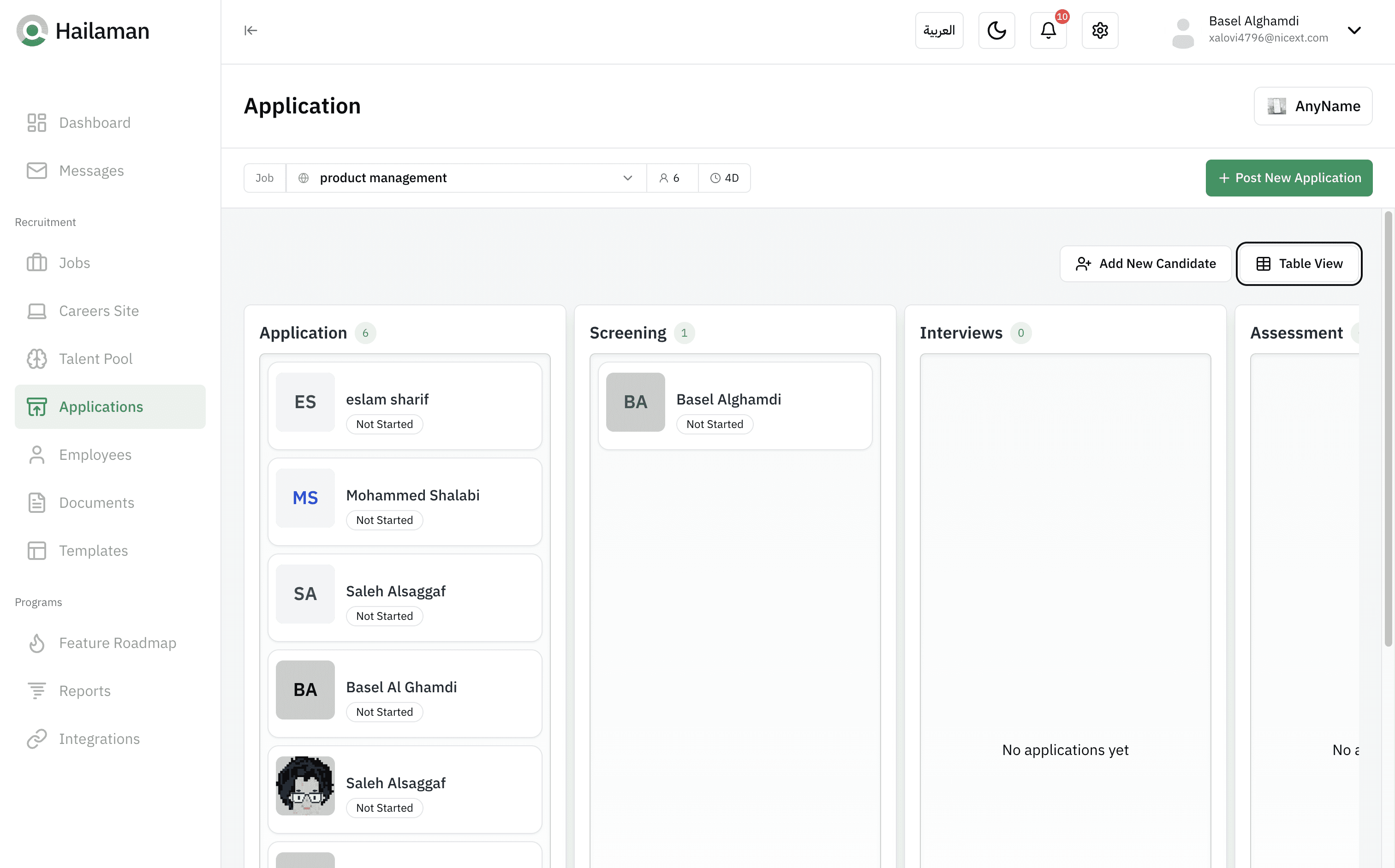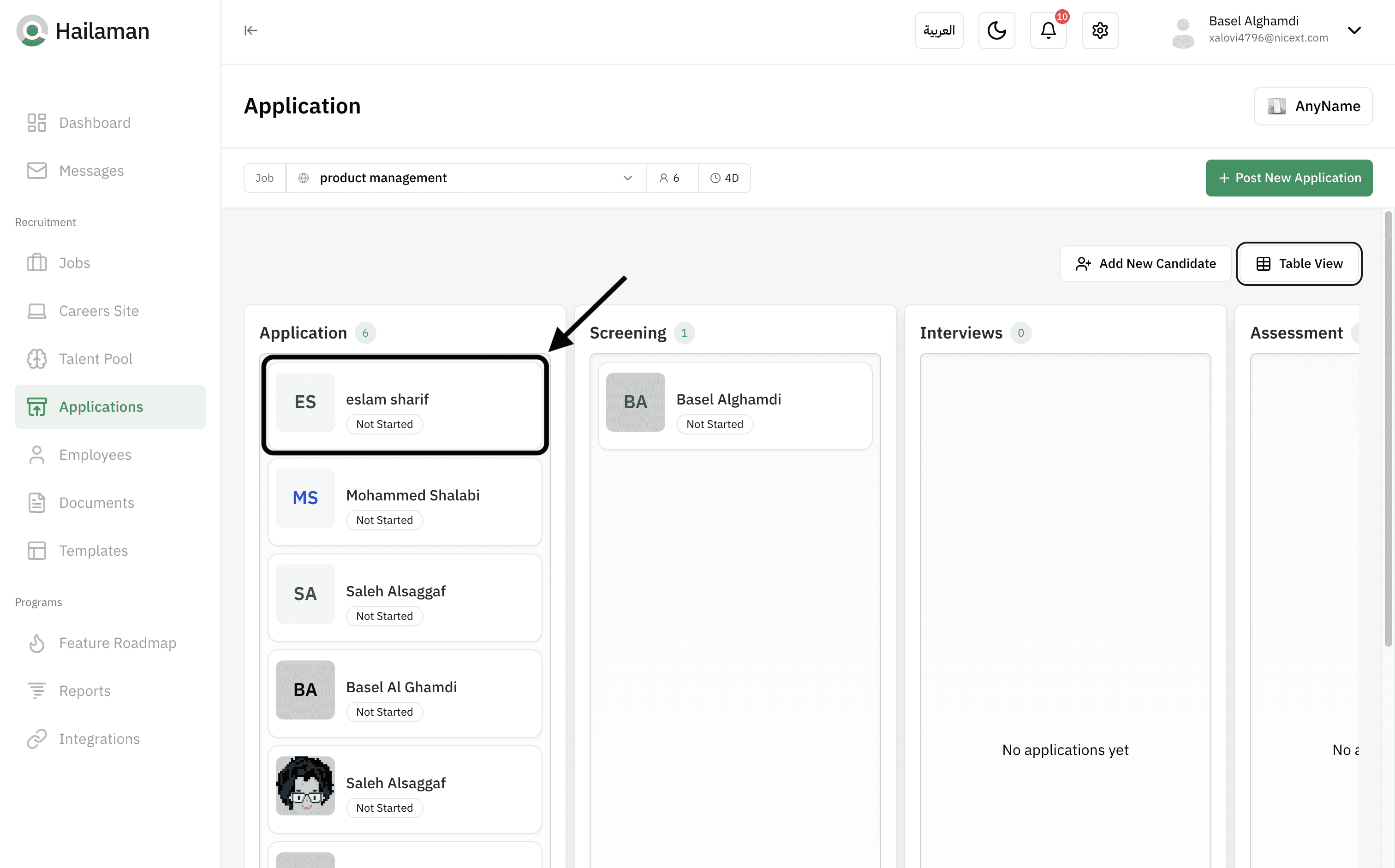 Here, you can set up the “Screening” stage for the applicant and write notes.