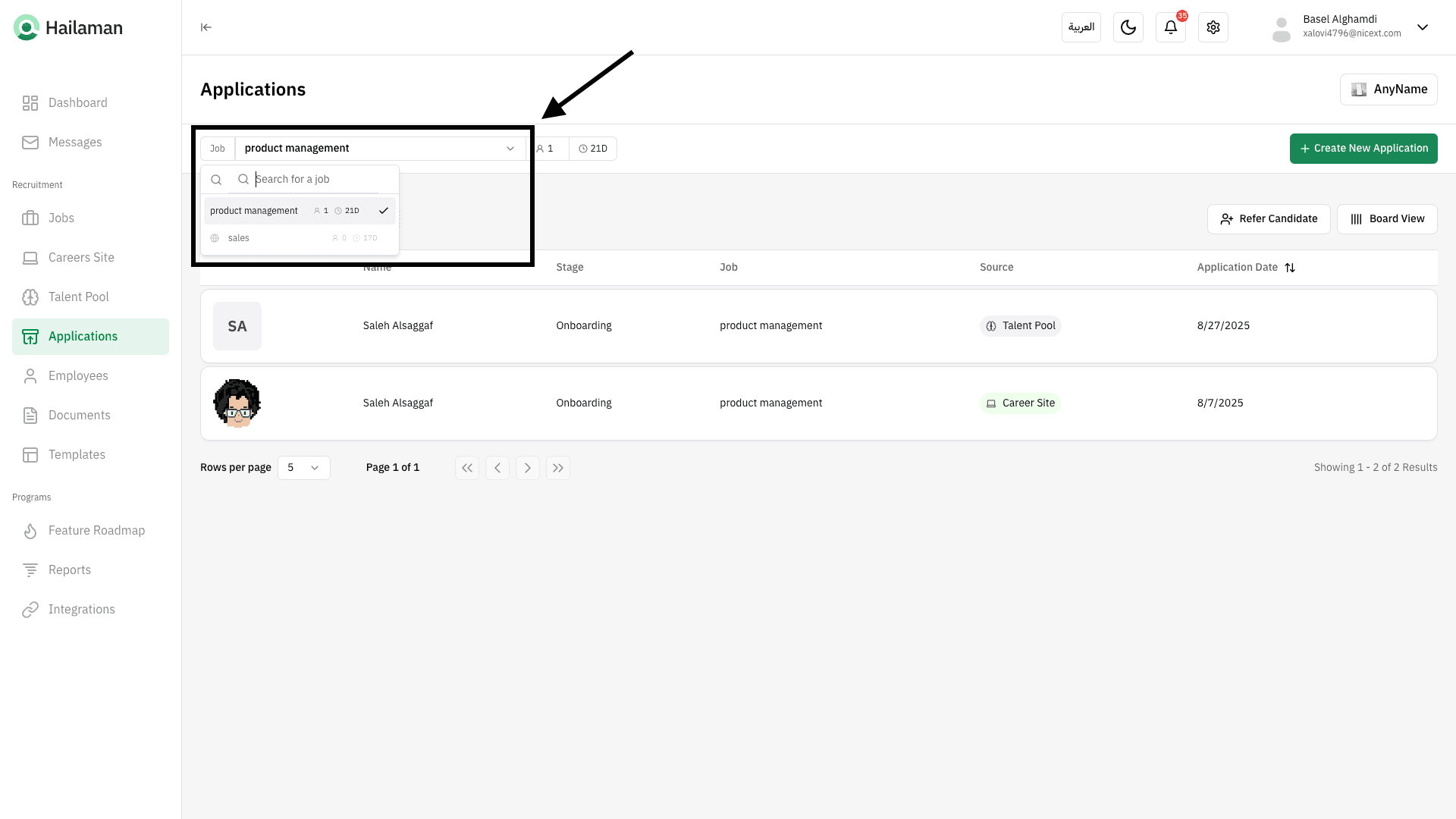 From here, you can select the job you want to track applicants for.