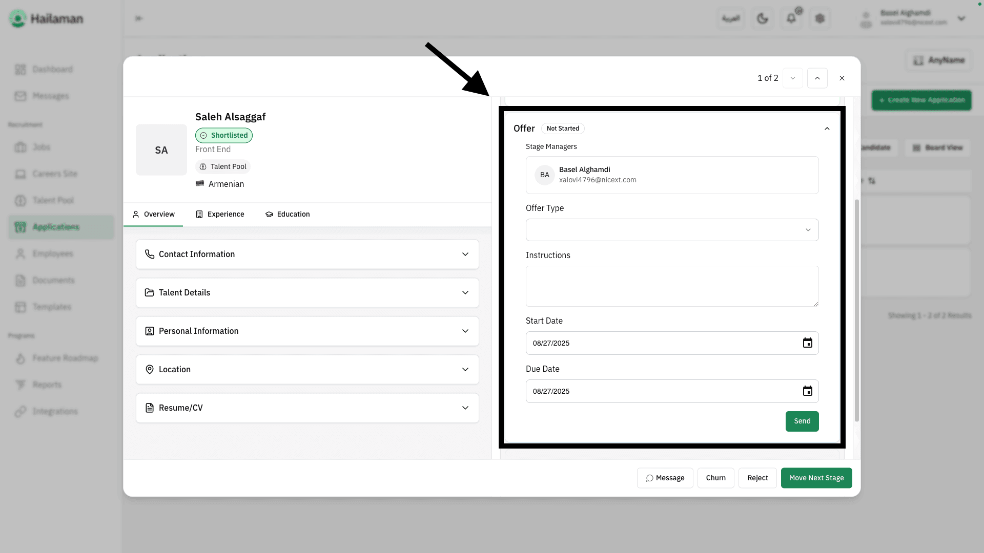 In the “Offer” stage, you can send the offer details to the applicant.