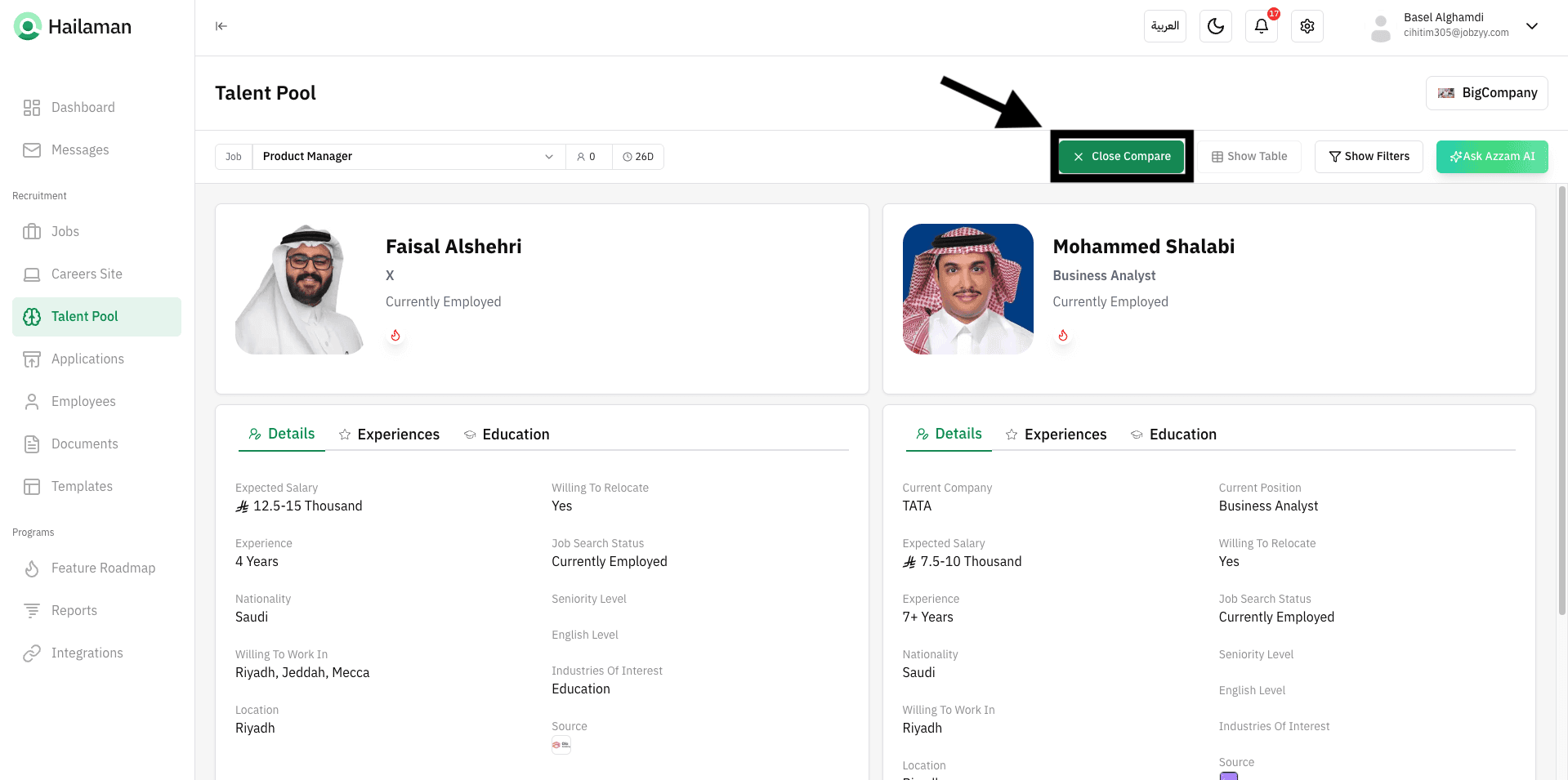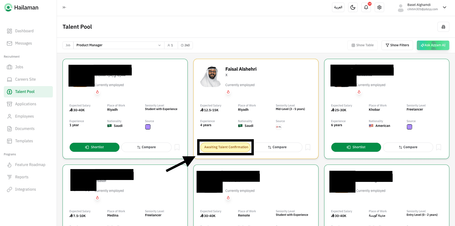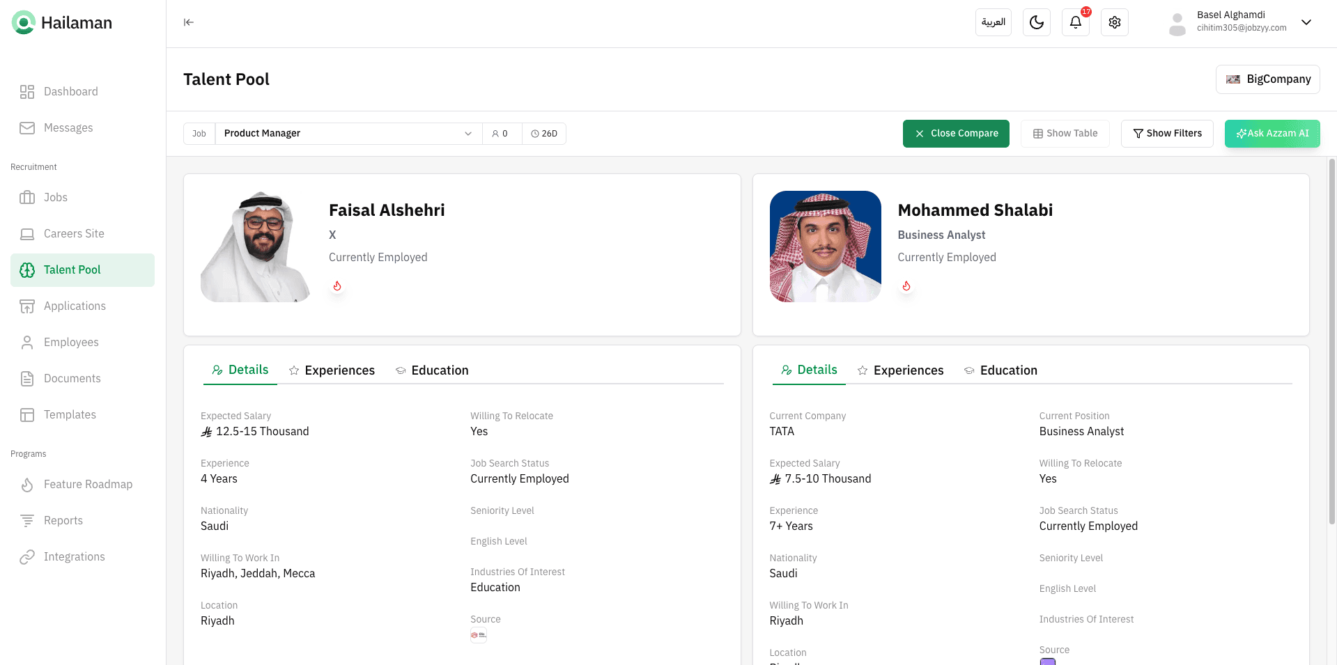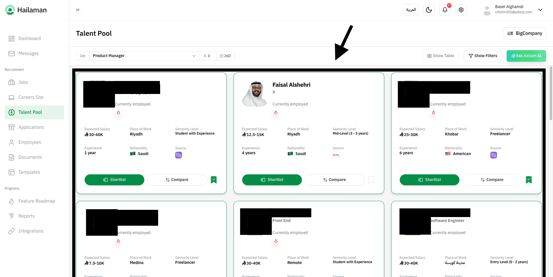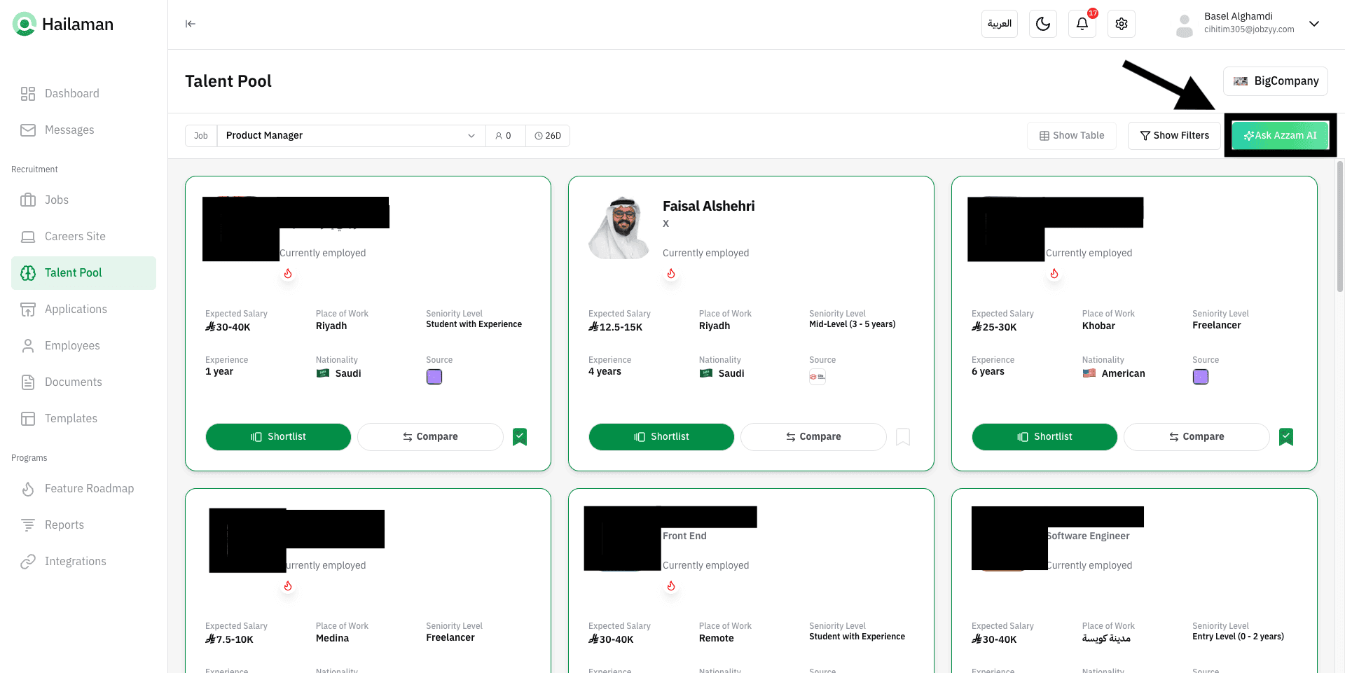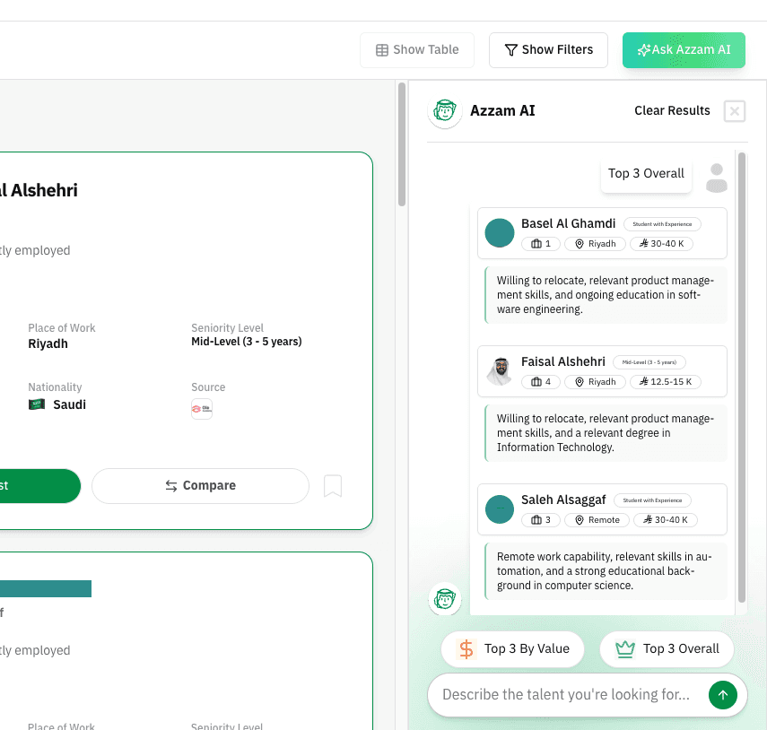 You can also click on “Ask Azzam AI” to use the AI assistant Azzam inside the platform to ask about the most suitable talents based on your company’s needs.