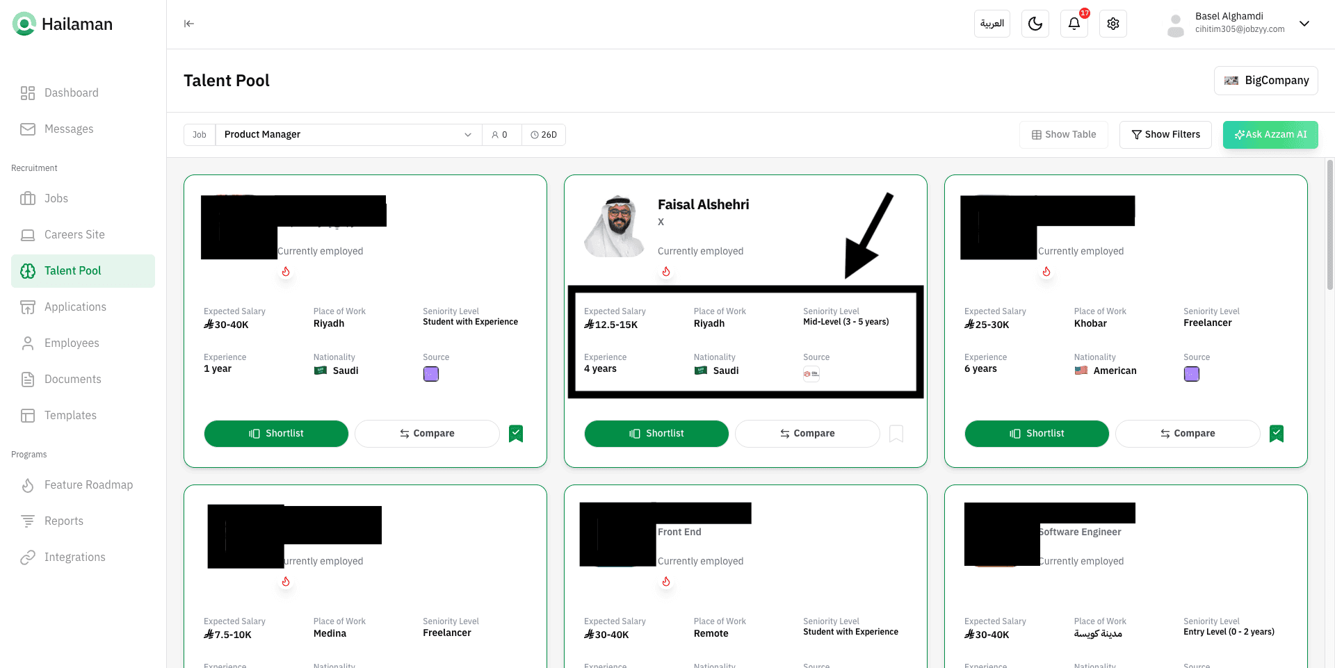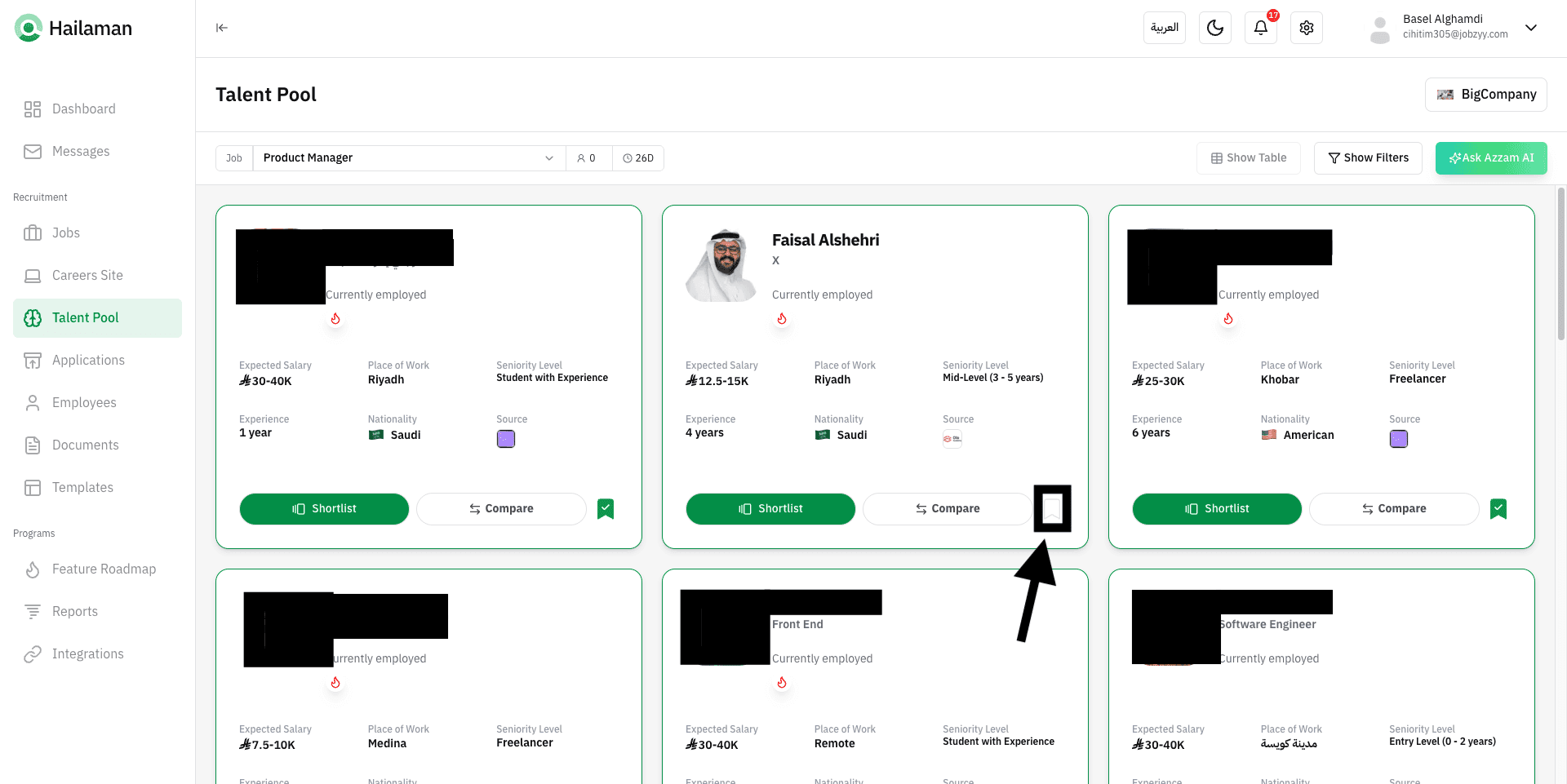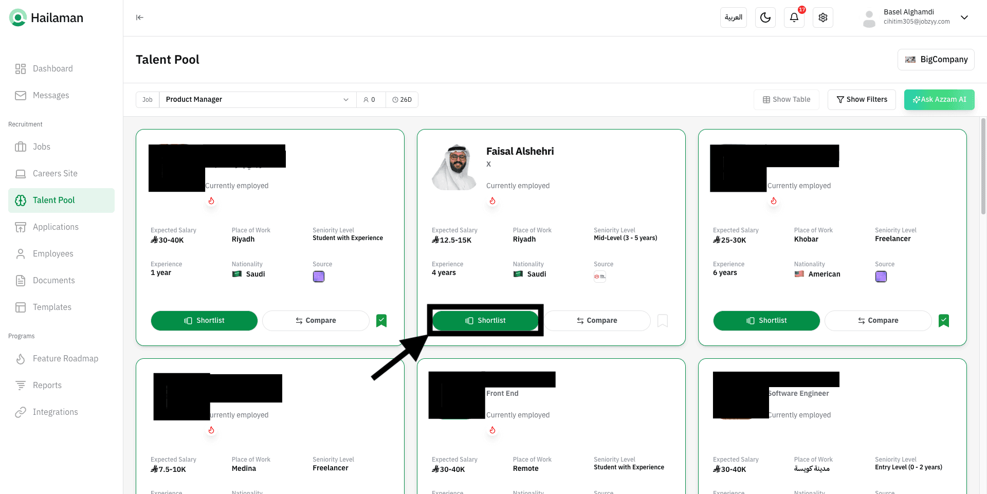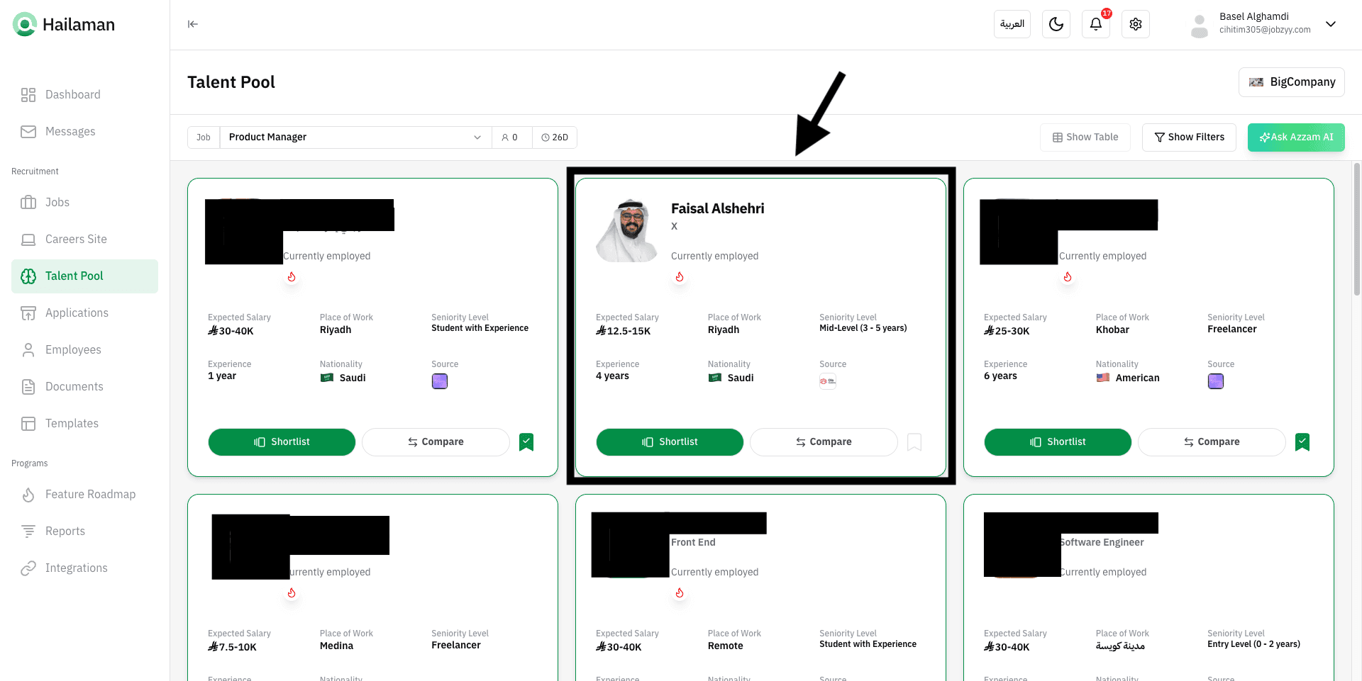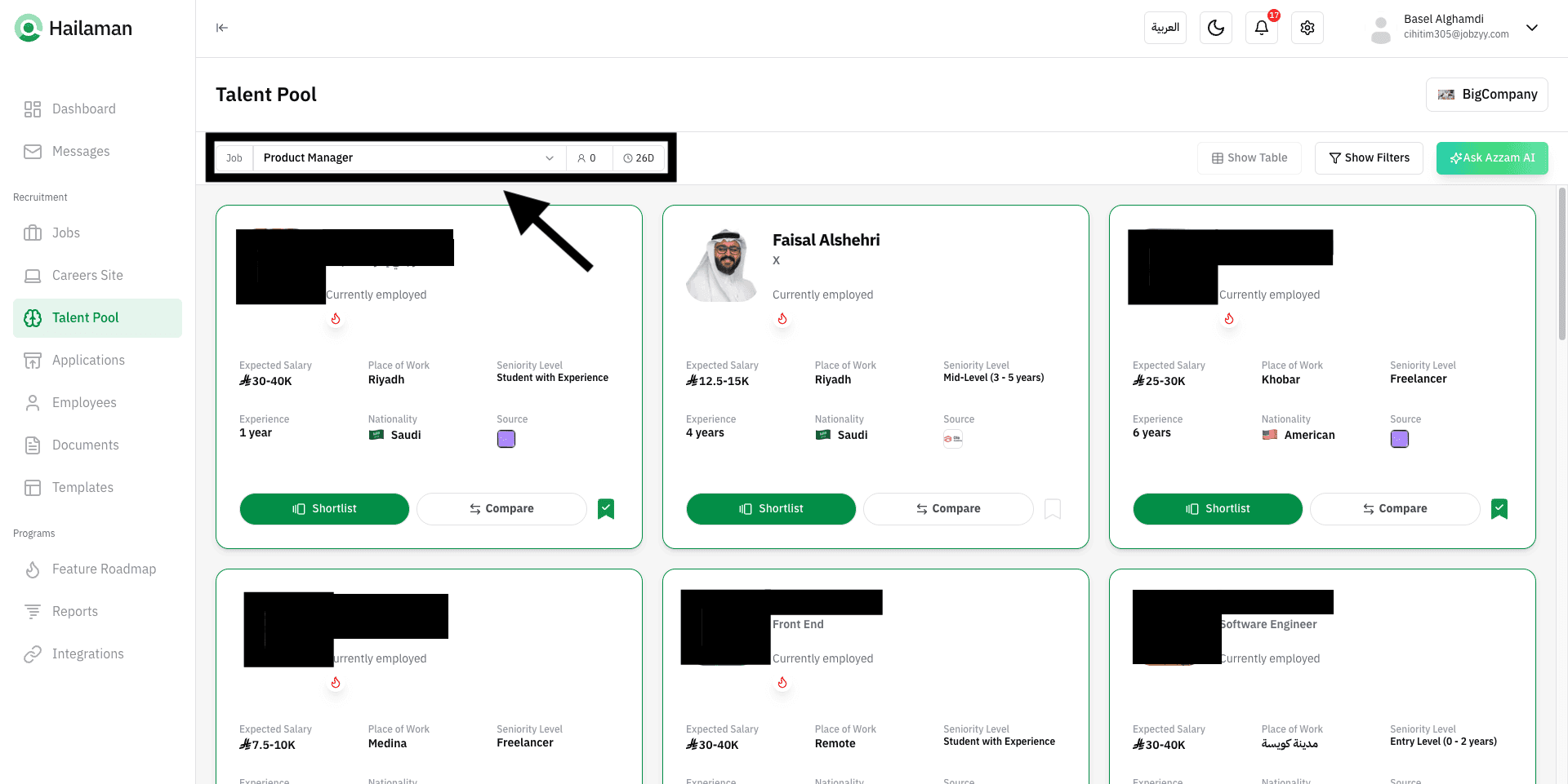 You can also click on “Ask Azzam AI” to use the AI assistant Azzam inside the platform to ask about the most suitable talents based on your company’s needs.