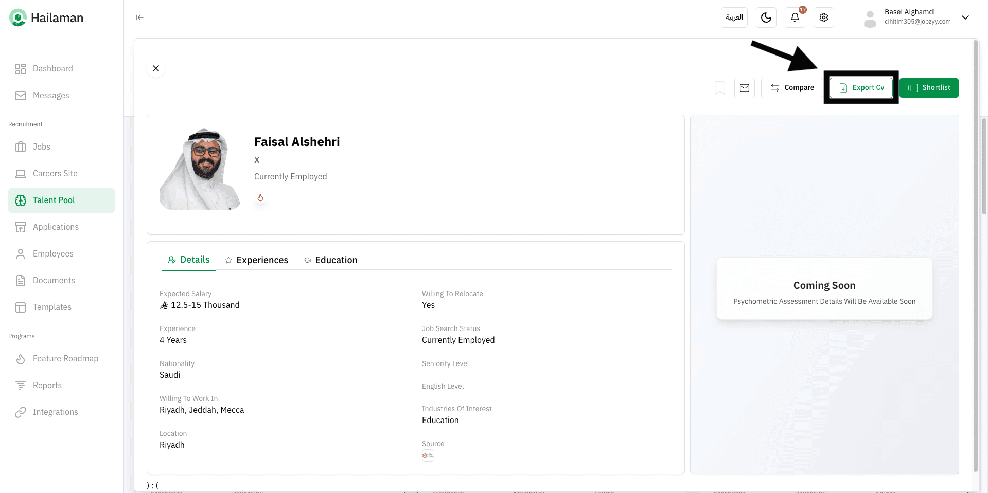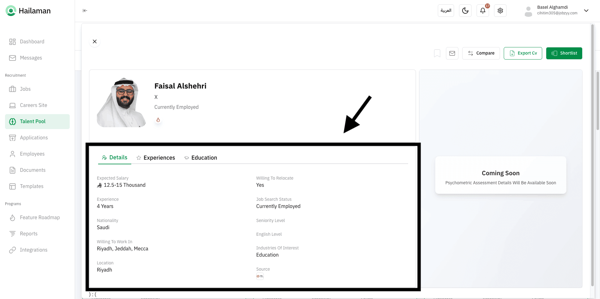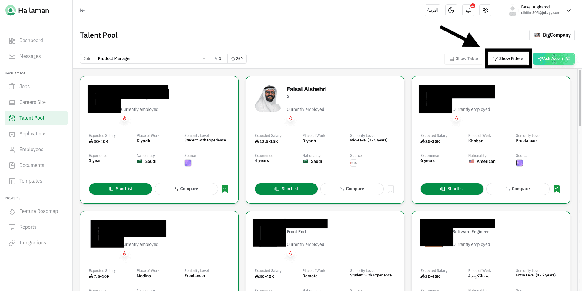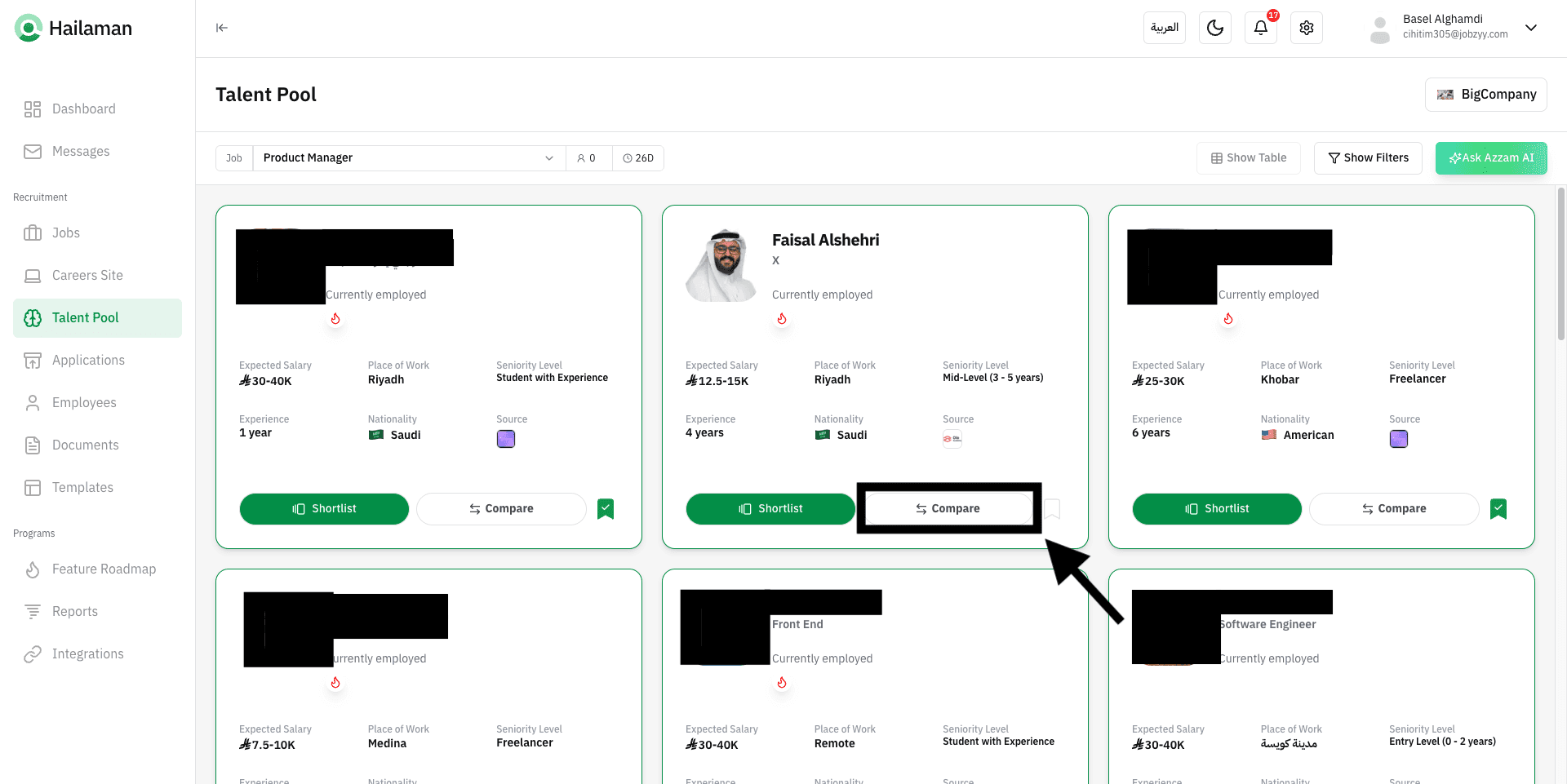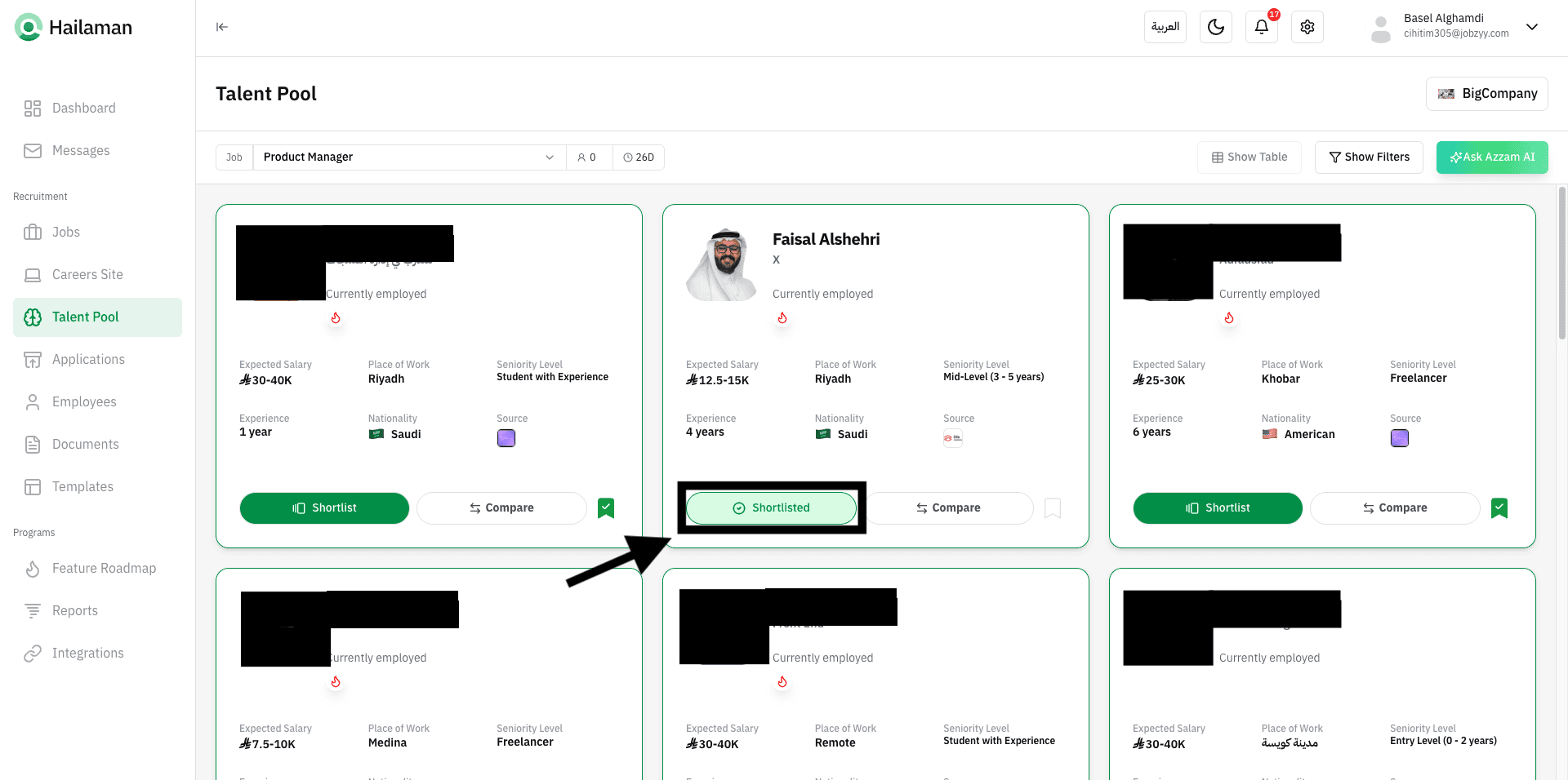 You can also click on “Ask Azzam AI” to use the AI assistant Azzam inside the platform to ask about the most suitable talents based on your company’s needs.