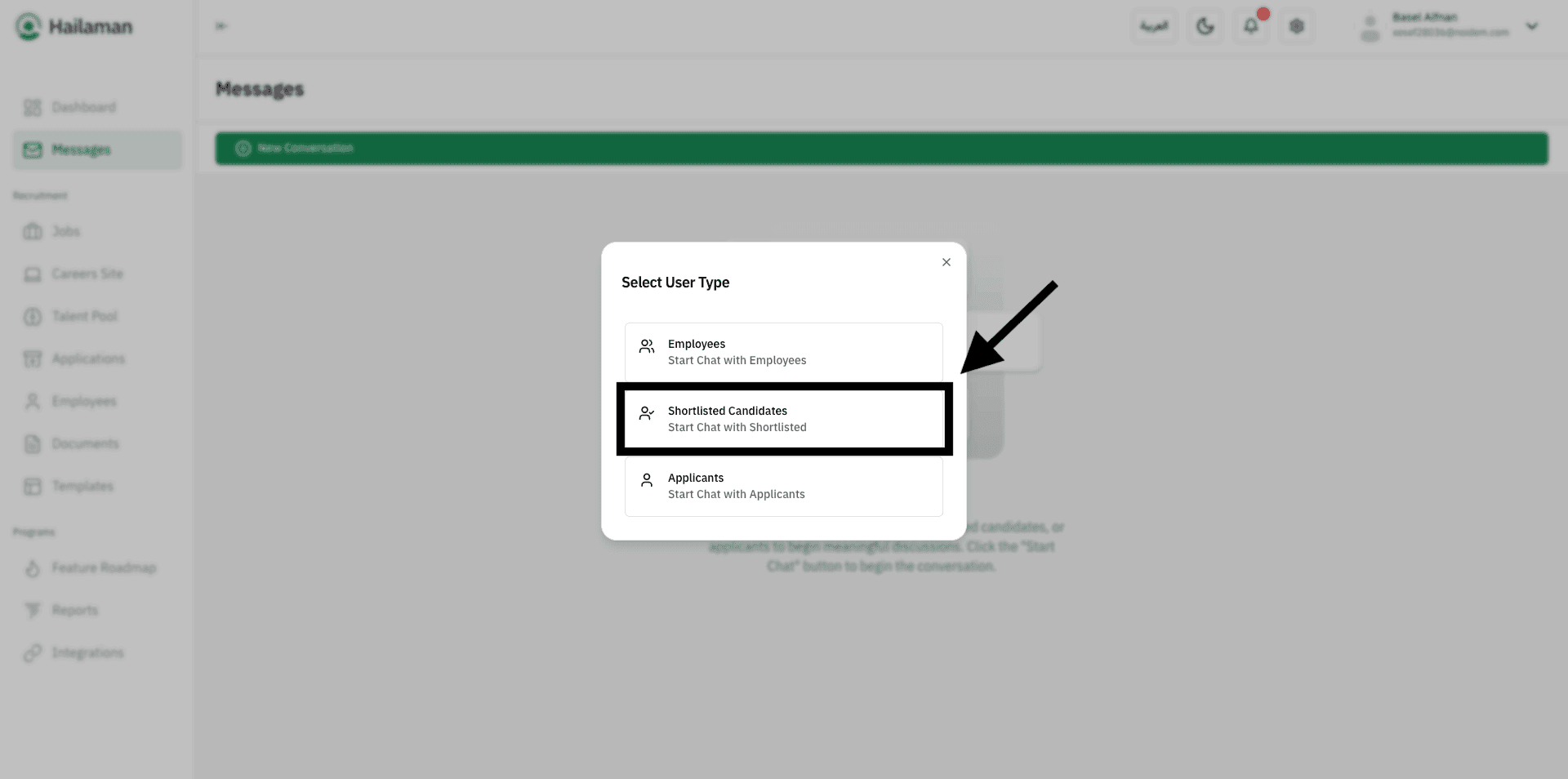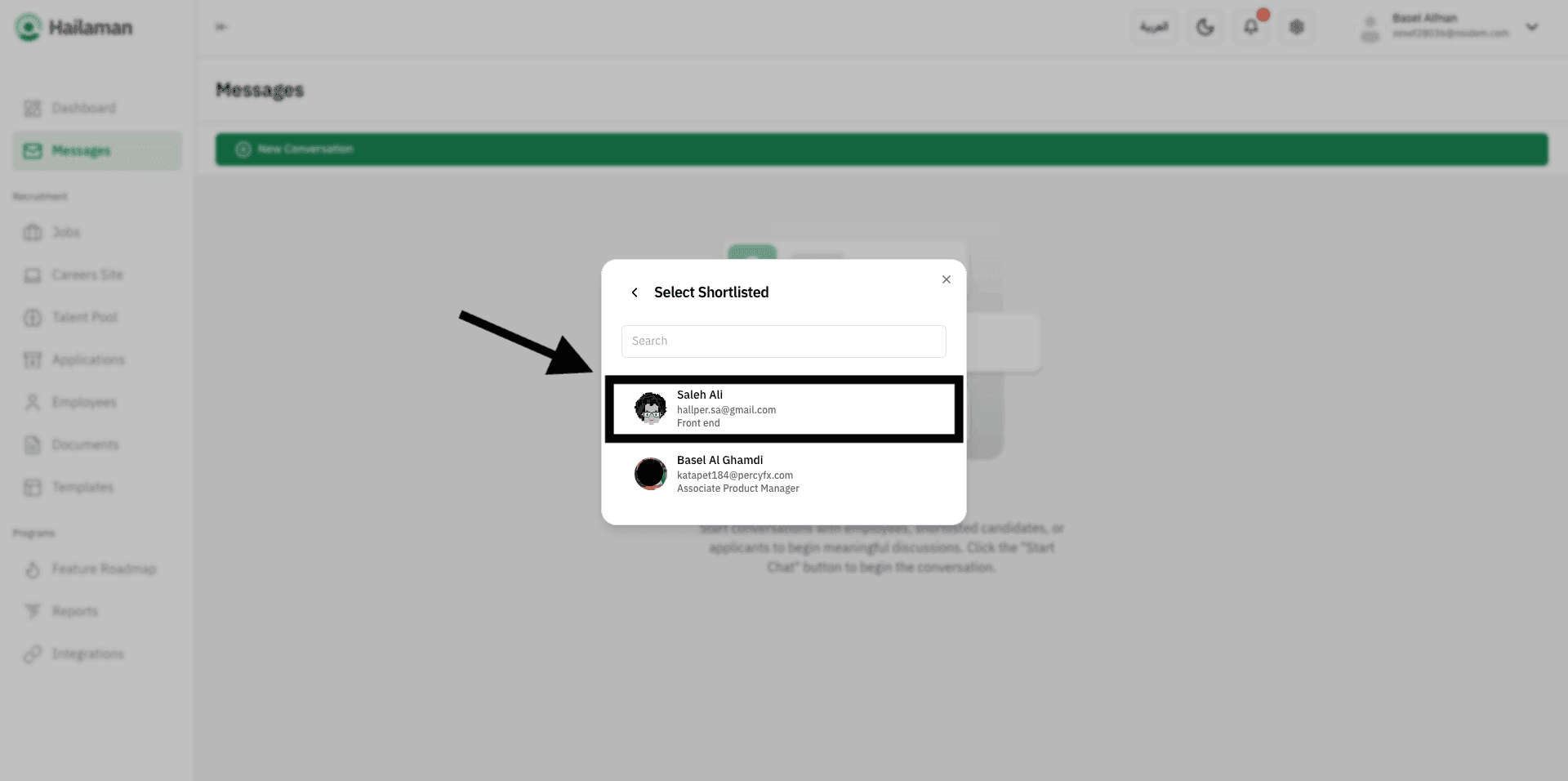 Click on “Selected Candidates” to start a conversation with a candidate.